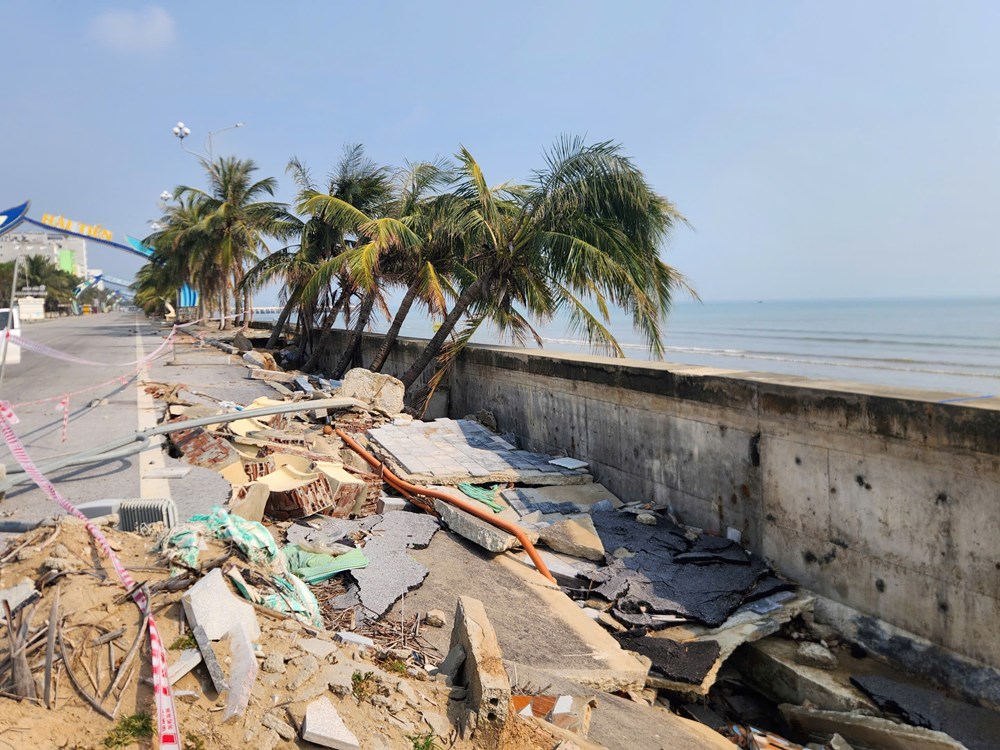 Trong nhiều năm, kè biển Hải Tiến đã phát huy hiệu quả rõ rệt. Nhờ tuyến kè này, hạ tầng du lịch được hình thành đồng bộ, các dự án lưu trú, nghỉ dưỡng mọc lên san sát, biến một vùng biển thuần nông, thuần ngư thành khu du lịch sôi động. Thế nhưng năm 2025, khi liên tiếp hứng chịu các cơn bão mạnh, đặc biệt là bão số 5 và số 10, công trình kè đã không còn trụ vững. Sóng lớn, gió mạnh và triều cường đã đánh bật từng mảng bê tông, làm sụt lún mái kè phía biển khiến nước tràn ngầm vào phía sau.