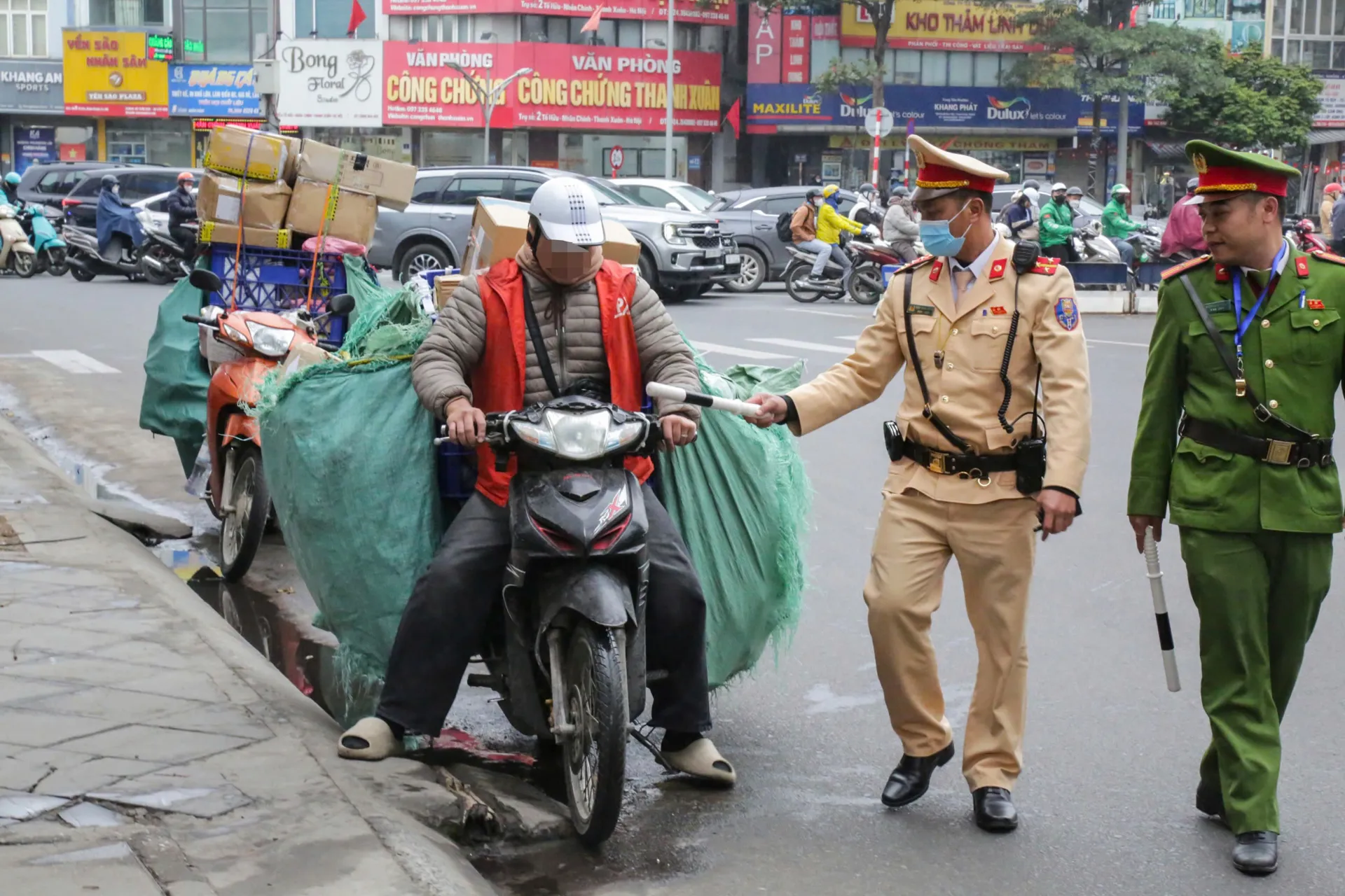 Lúc 9h, tổ công tác phát hiện tài xế L.Q.L. (31 tuổi, quê Thanh Hóa) điều khiển xe máy chở hàng cồng kềnh, hàng hóa làm che khuất biển kiểm soát, nên đã dừng xe để kiểm tra. Qua kiểm tra phương tiện, cảnh sát cho biết số hàng hóa mà anh L. chằng buộc trên xe đã làm che khuất biển kiểm soát. Ngay sau đó, cảnh sát đã dùng thiết bị nghiệp vụ để ghi lại hình ảnh vi phạm, lấy căn cứ để xử lý trường hợp vi phạm.