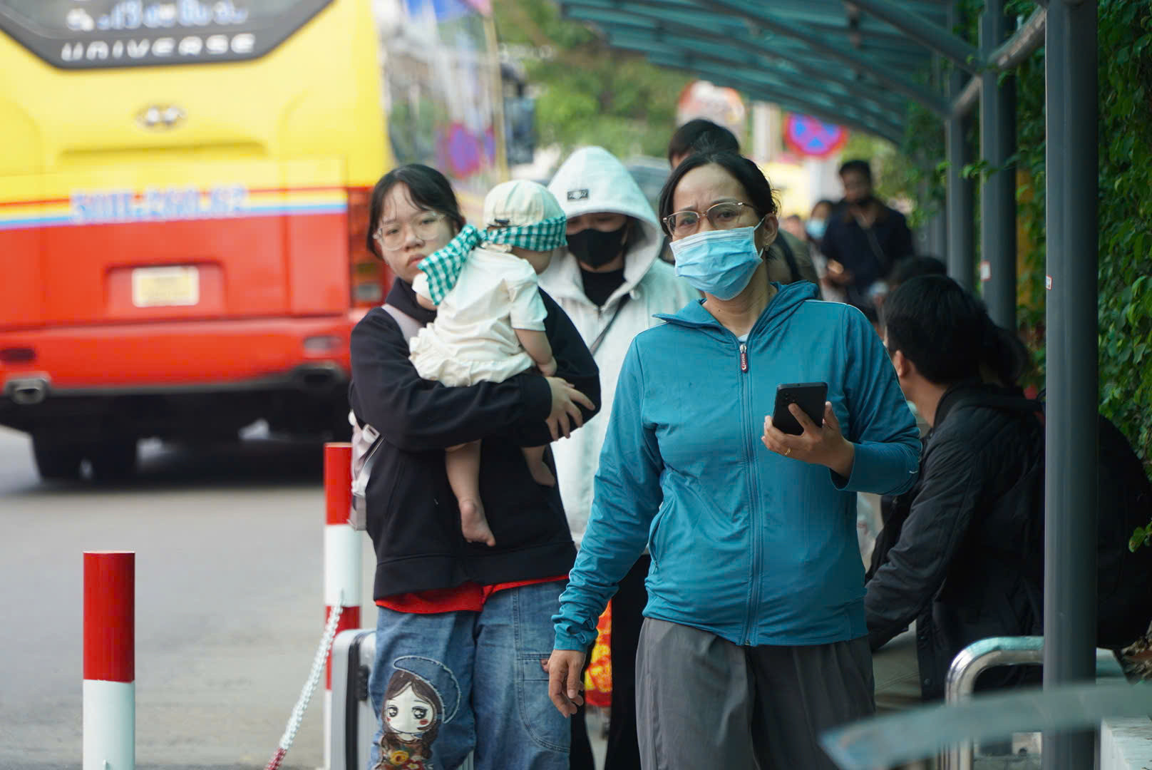 Hành khách đứng chờ người thân đến đón hoặc đặt xe công nghệ để về nhà tại bến xe Miền Tây. Ảnh: MT