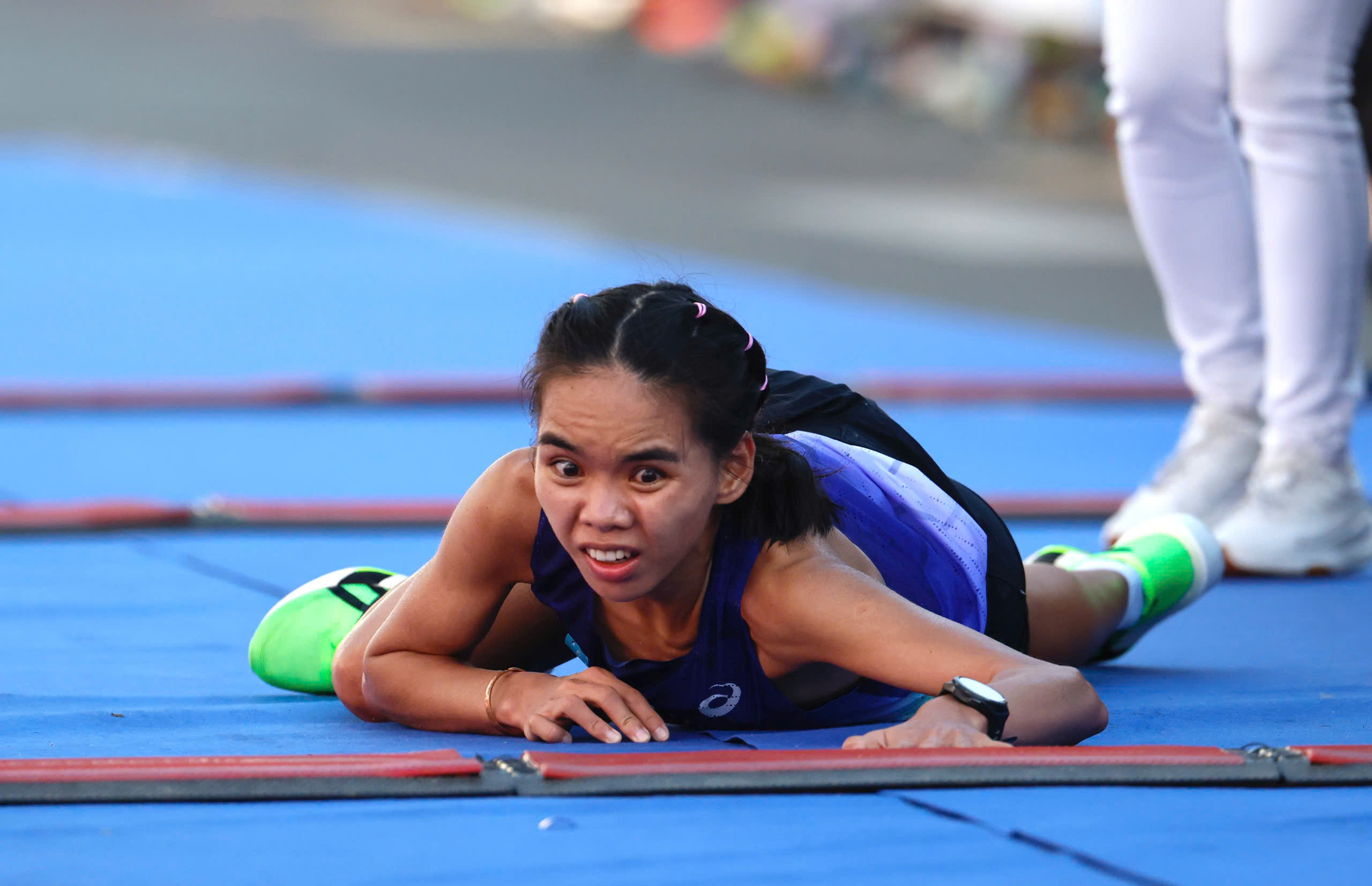 Đến sát vạch đích, Ngọc Hoa lảo đảo ngã xuống đường chạy. Cô cố gắng vươn tay chạm vạch và trườn qua đích, bấm đừng đồng hồ để hoàn thành phần thi. Đội ngũ y tế nhanh chóng có mặt để hỗ trợ vận động viên này.