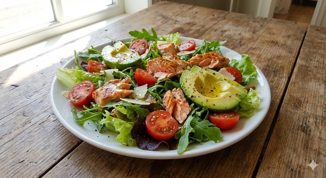 Món salad cá hồi bơ chứa chất xơ, chất béo lành mạnh và protein cần thiết giúp giảm tác hại của rượu bia ngày Tết. (Ảnh minh họa AI)