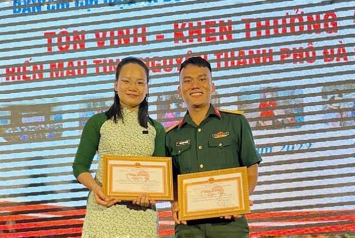 Vợ chồng anh Trần Minh Thưởng nhận bằng khen về công tác hiến máu tình nguyện năm 2025. Ảnh: LAM PHƯƠNG