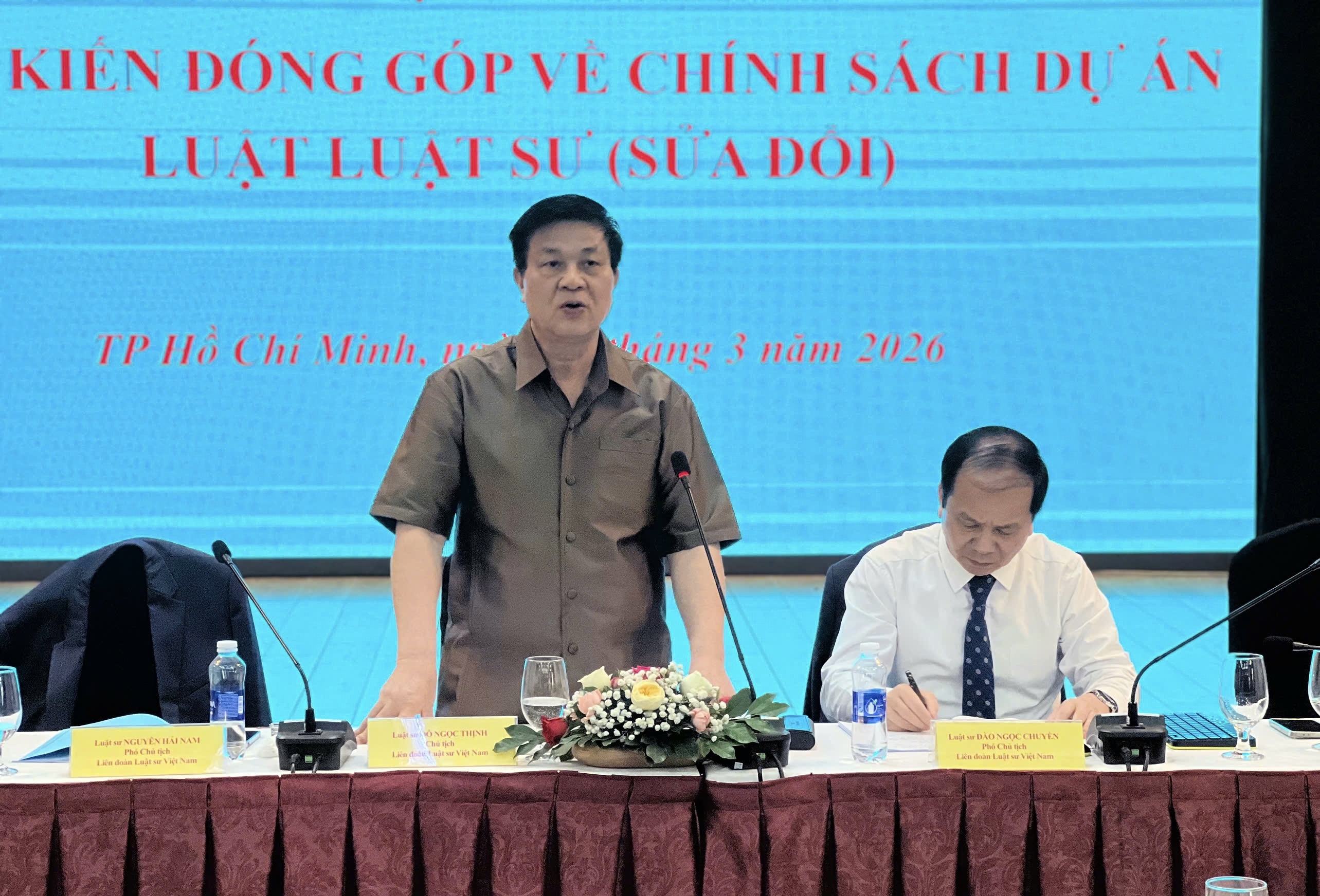 Trong phần báo cáo dẫn đề, luật sư Diệp Hoài Nam, ủy viên Ban Thường vụ Liên đoàn Luật sư Việt Nam, Chủ nhiệm Ủy ban Xây dựng pháp luật và Trợ giúp pháp lý, Liên đoàn Luật sư Việt Nam, trình bày nội dung dự thảo tờ trình và quan điểm của Liên đoàn Luật sư Việt Nam.