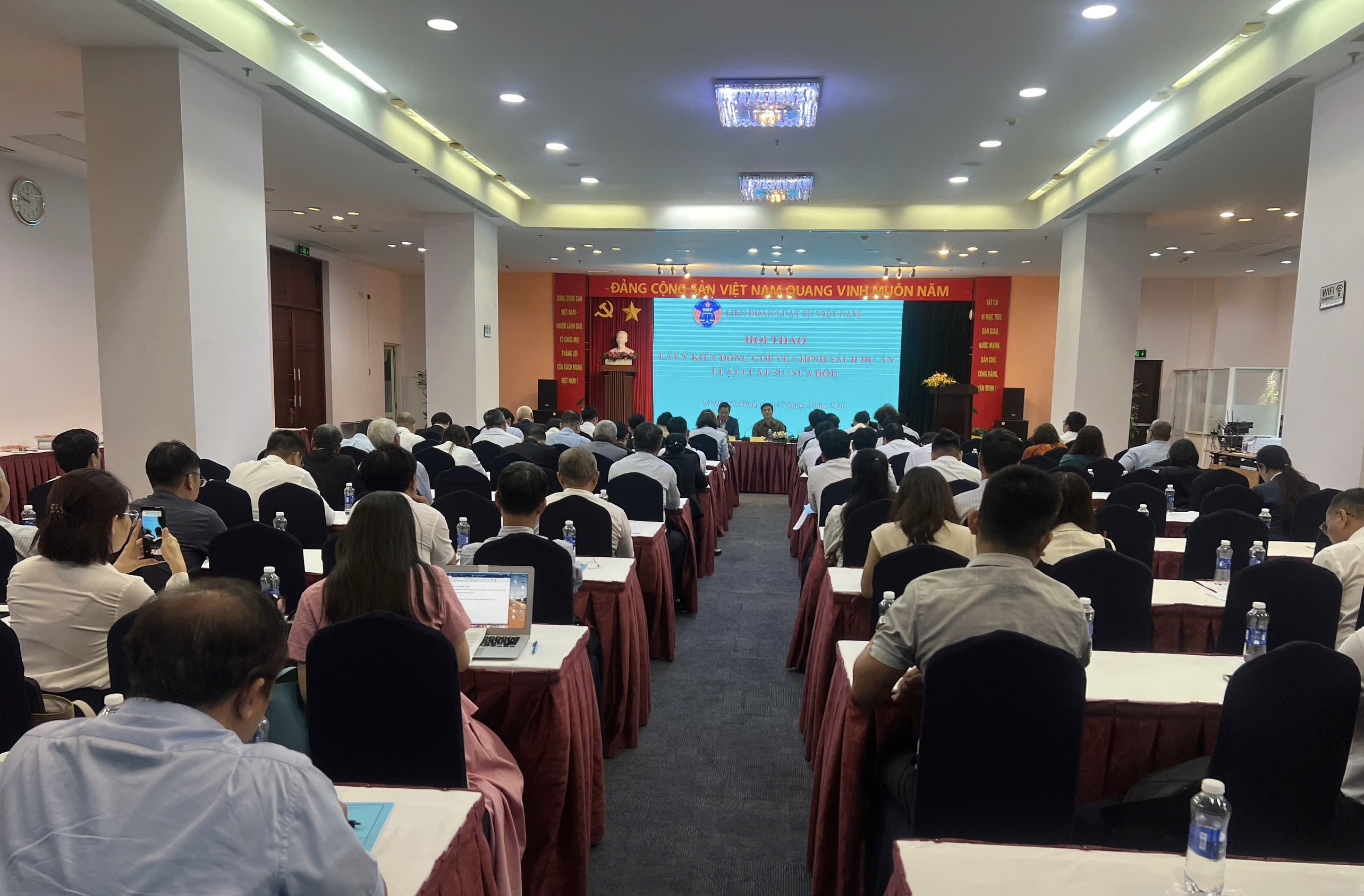 TS.LS Đỗ Ngọc Thịnh, Chủ tịch Liên đoàn Luật sư Việt Nam (giữa), chủ trì hội thảo. Ảnh: THÙY DƯƠNG