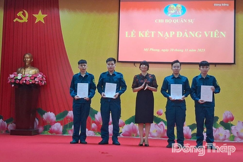 Lễ kết nạp đảng viên mới. Nguồn: Đảng ủy phường Mỹ Phong.