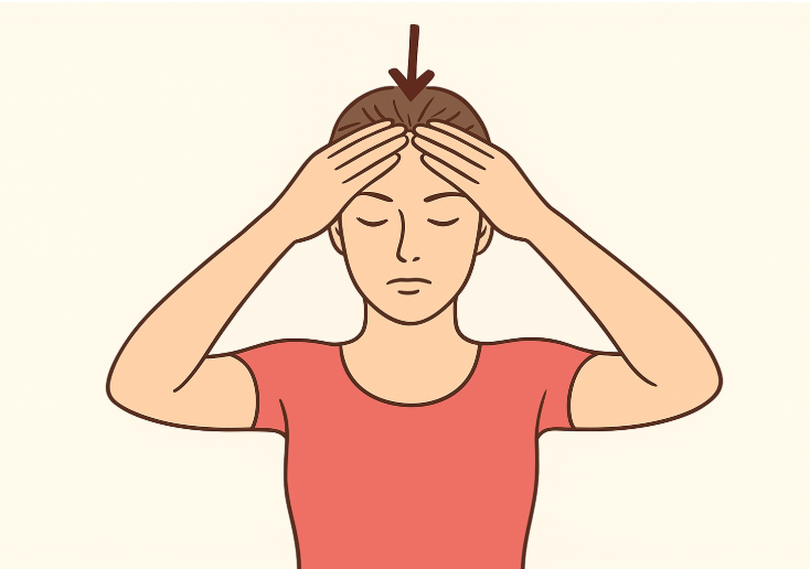 Đặt lòng bàn tay lên trán, nhẹ nhàng dùng đầu đẩy về phía tay trong khi tay tạo một lực cản nhẹ. Giữ tư thế này trong khoảng 10 giây.