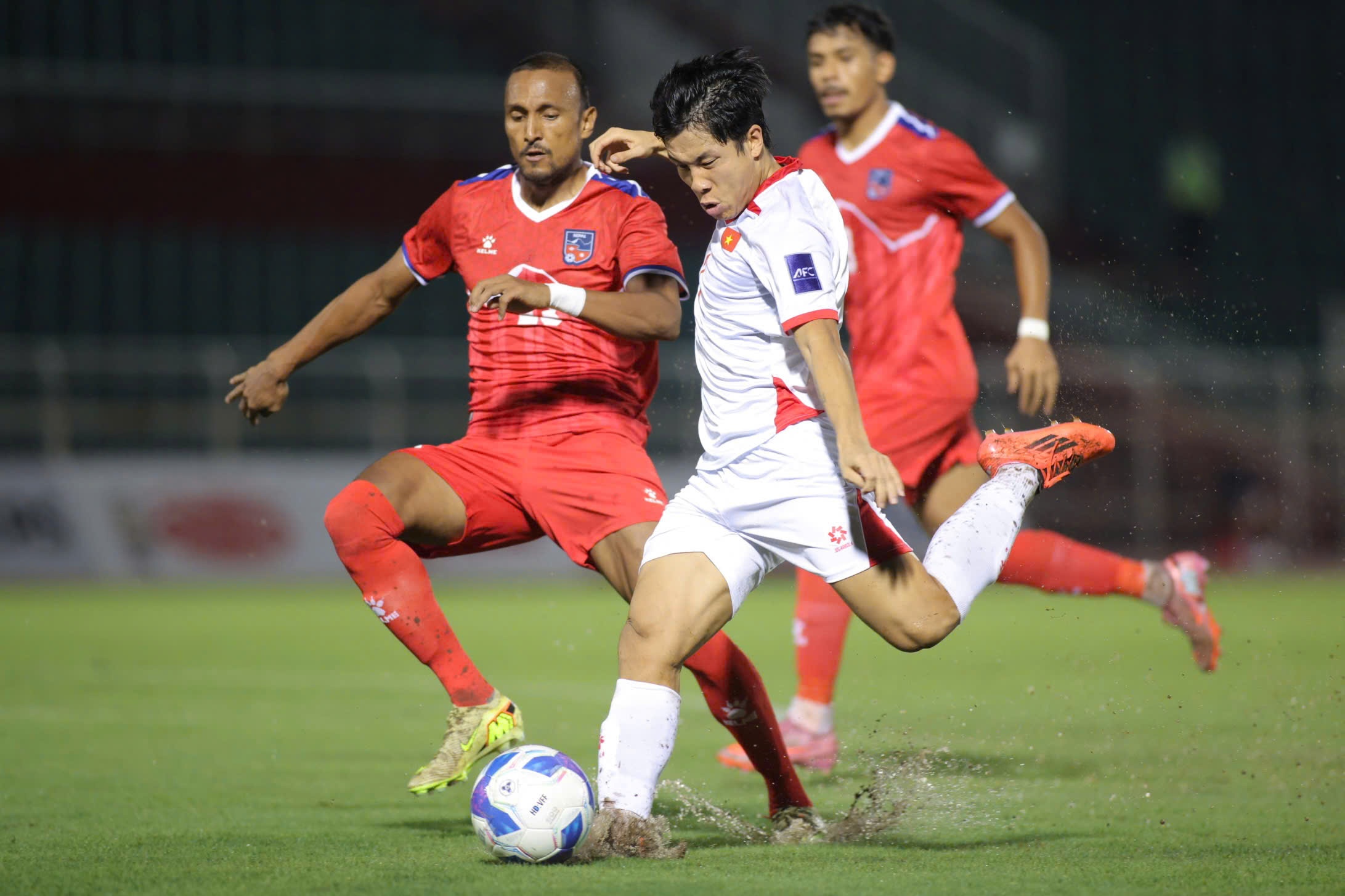 Ngay phút thứ 3, hàng thủ tuyển Việt Nam để lộ khoảng trống cho số 21, Manish Dangi thoát xuống đối mặt thủ môn. Thậm chí, Duy Mạnh còn bị trượt ngã trong pha tranh chấp. Dù vậy, vũng nước trước cầu môn khiến tiền đạo của Nepal không thể dứt điểm. Ngay lập tức, tuyển Việt Nam trong vị thế đội khách, có câu trả lời bằng cú sút chéo góc đưa bóng đi chệch cột trong gang tấc của Văn Vĩ.