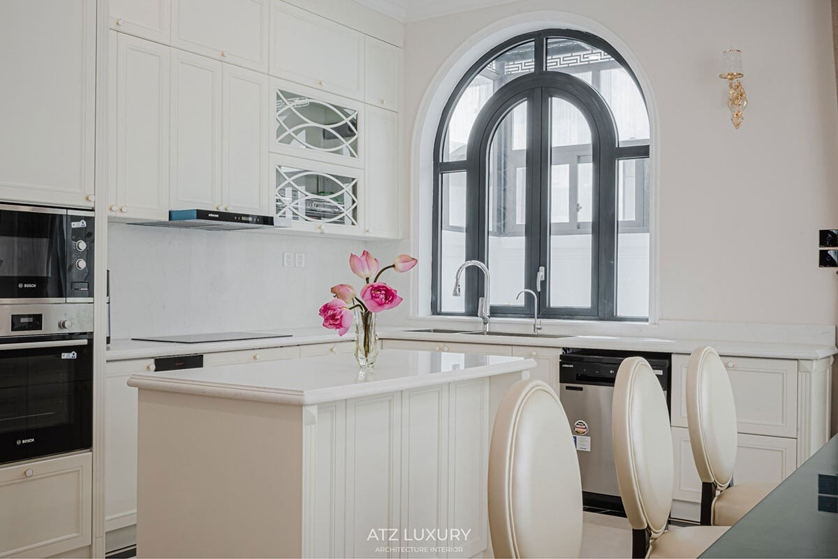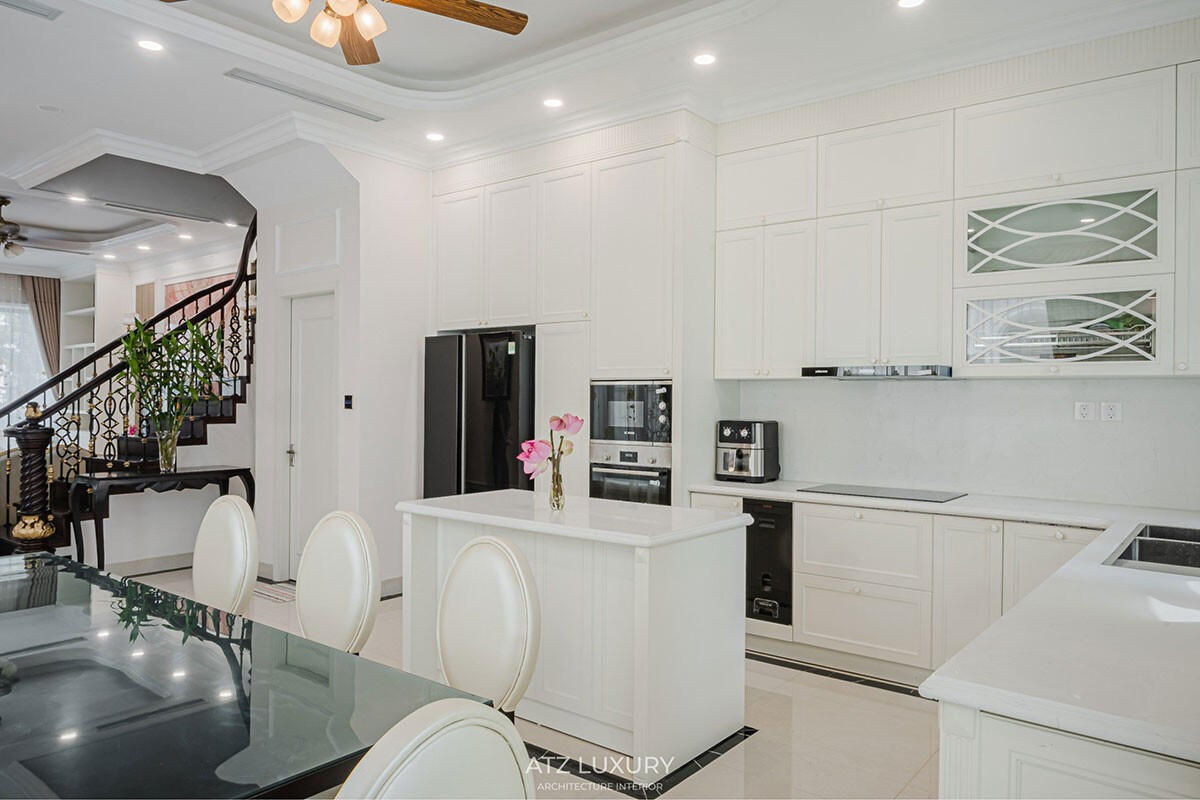 Không gian bếp và phòng ăn được thiết kế thống nhất với phong cách chung nhưng mang hơi thở hiện đại rõ rệt hơn. Hệ tủ bếp chữ L kết hợp đảo bếp màu trắng chủ đạo đem lại cảm giác sạch sẽ, tinh giản, mỗi chi tiết đều hướng tới sự tiện nghi và tối ưu trải nghiệm sử dụng.
