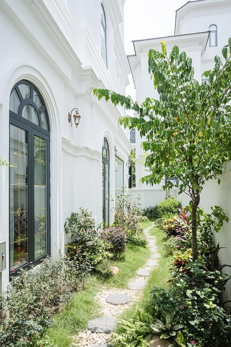 Bao quanh công trình là một “vành đai xanh” được kiến tạo tỉ mỉ. Lối dạo rải sỏi len giữa vườn cây không chỉ góp phần lọc bụi, giảm tiếng ồn mà còn như một cánh cửa chuyển tiếp giữa nhịp sống đô thị ồn ào và sự bình yên.