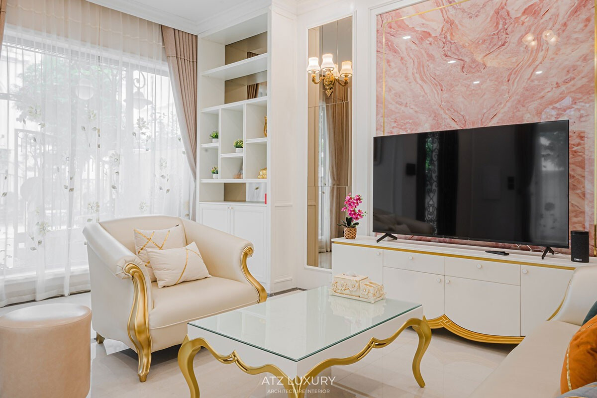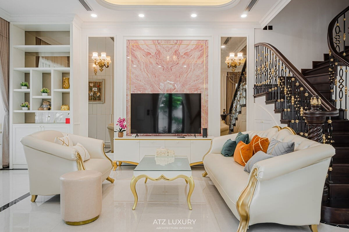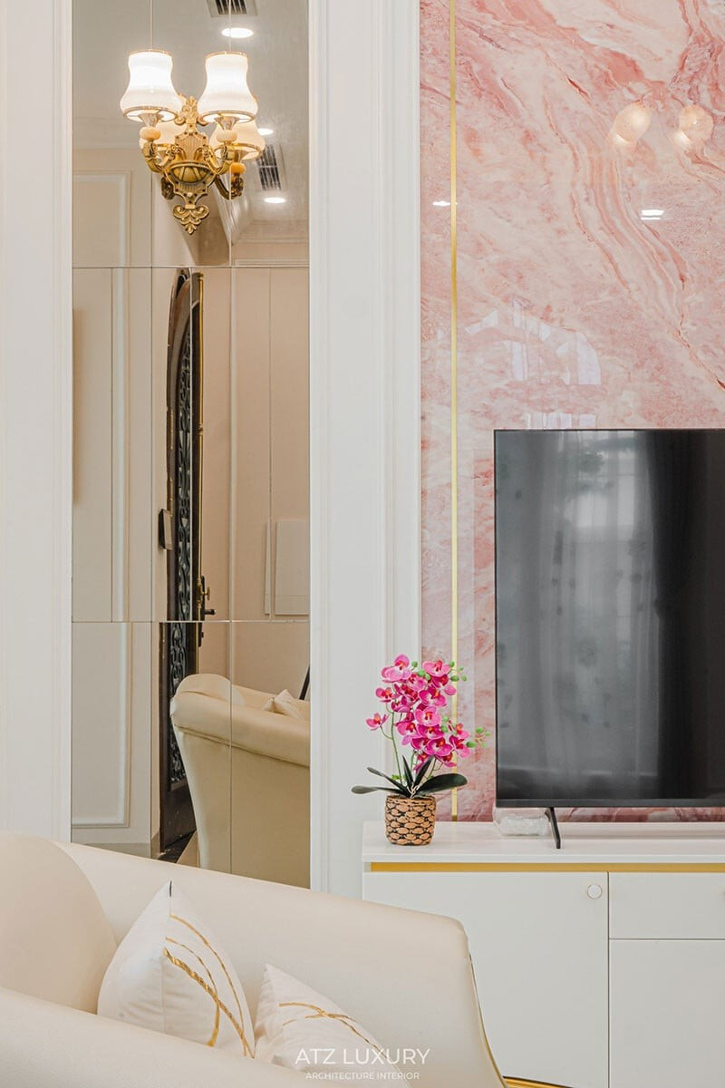 Điểm nhấn thị giác ấn tượng nhất nằm ở bức tường sau TV được ốp đá marble vân hồng tự nhiên. Đó không còn là một vách trang trí đơn thuần, mà trở thành mảng nghệ thuật khơi dậy sự ấm áp giữa gam màu trắng - kem chủ đạo.