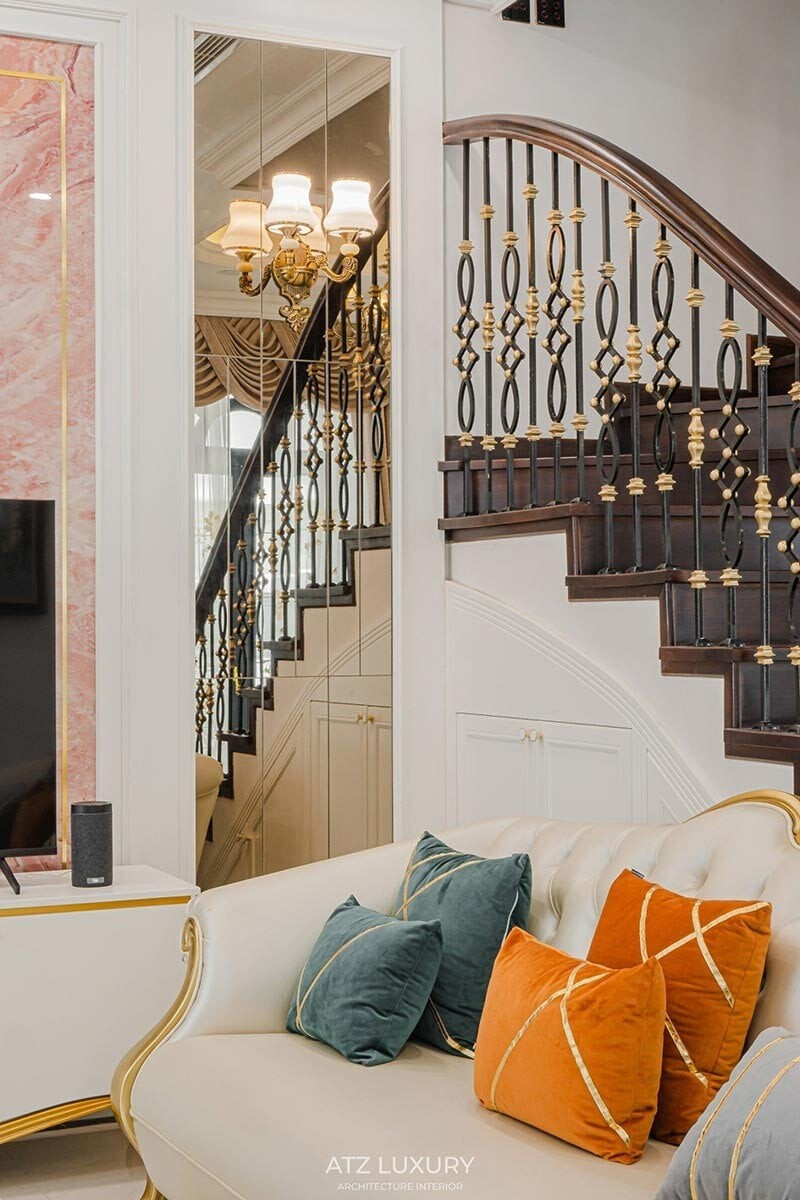 Cầu thang uốn lượn duyên dáng như một dải lụa, nổi bật bởi tay vịn gỗ tối màu tương phản nền tường trắng. Hệ lan can sắt mỹ thuật mạ vàng gợi nhắc vẻ hào hoa châu Âu, kết nối tinh tế với những chi tiết vàng son trên từng món nội thất.