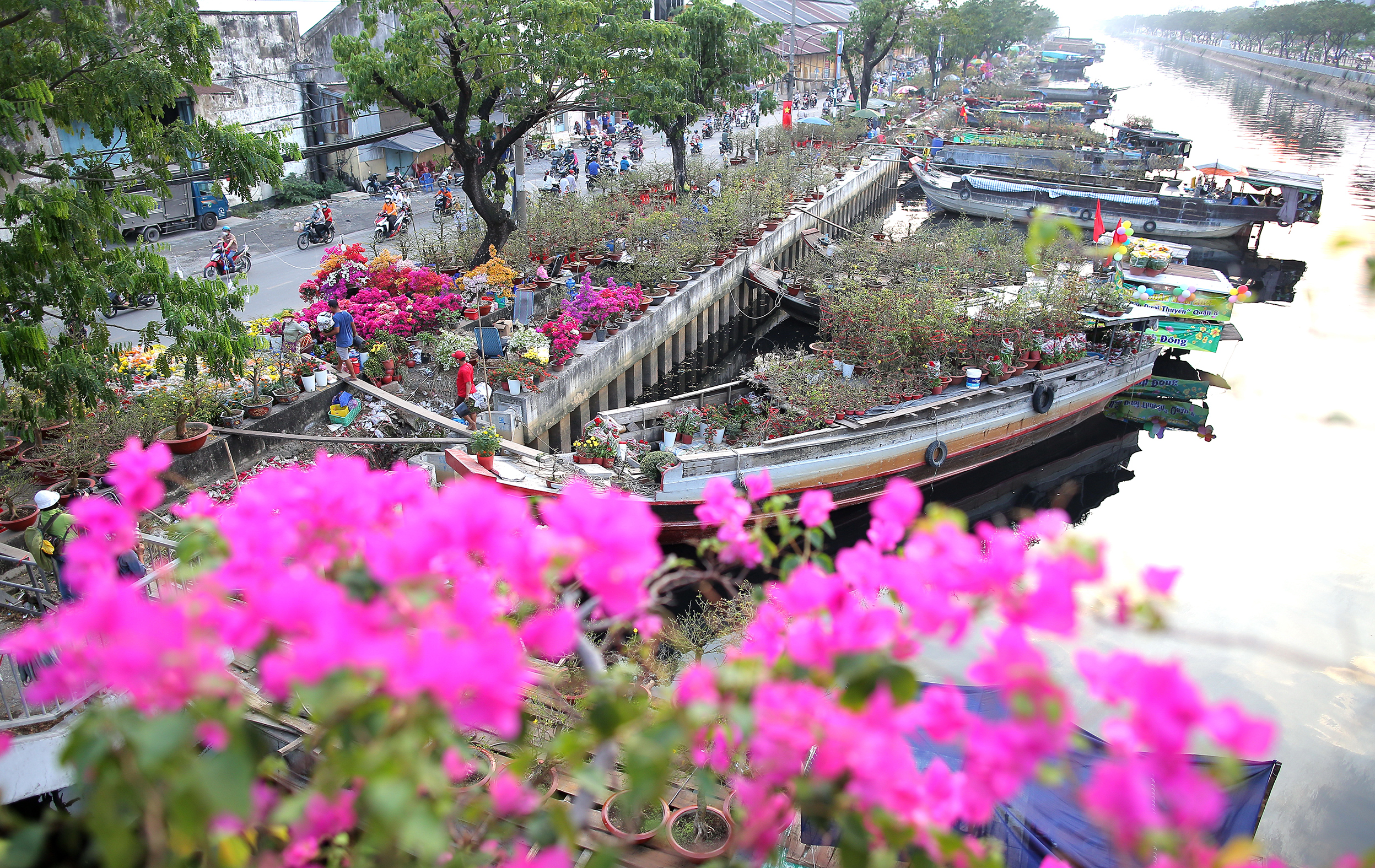 Chợ hoa xuân “Trên bến dưới thuyền” trong những ngày Tết Nguyên đán ở khu vực Bến Bình Đông. Ảnh: DŨNG PHƯƠNG