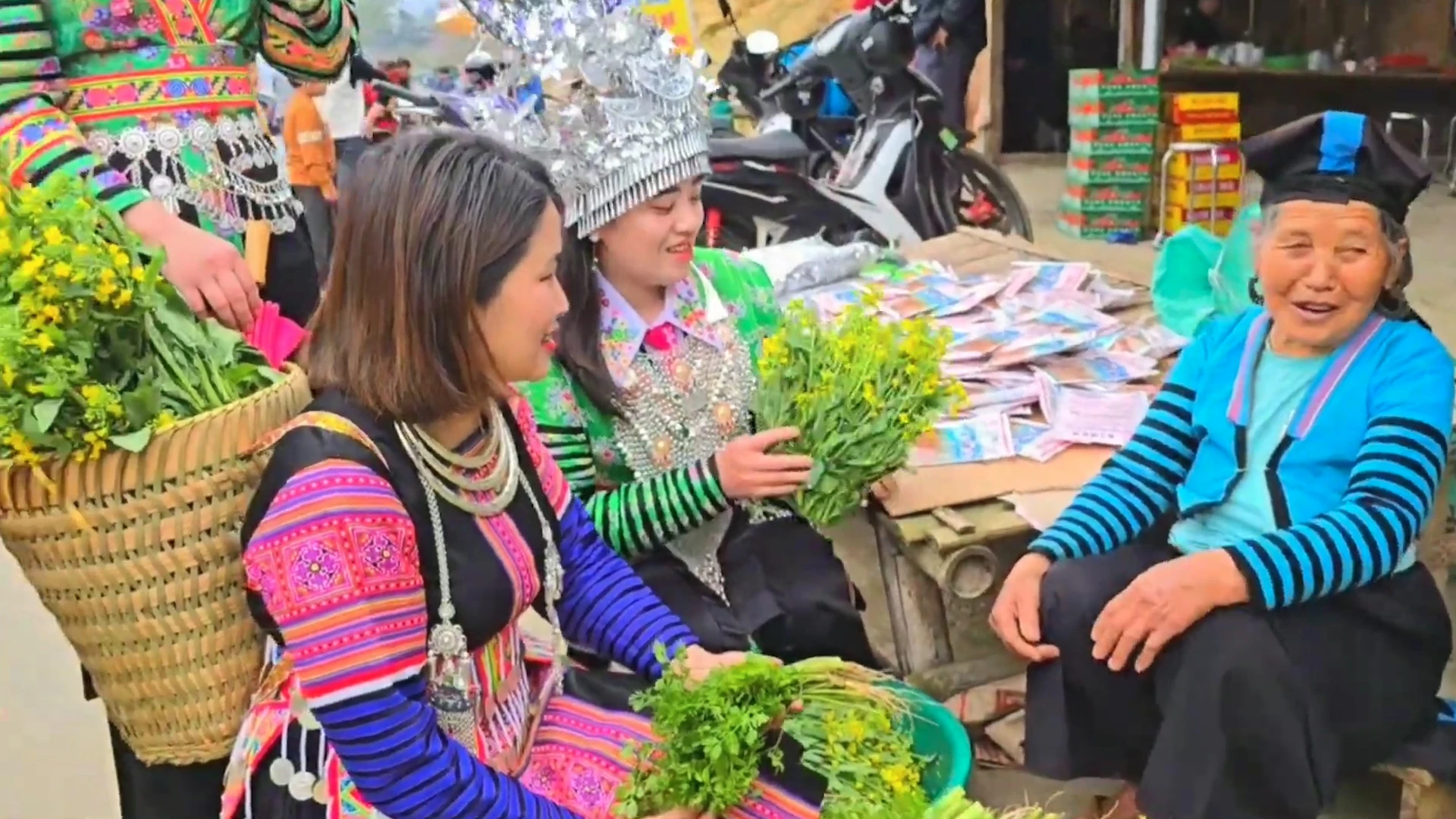 Phụ nữ Mông trong trang phục truyền thống tại chợ tình biên giới những ngày gần tết.