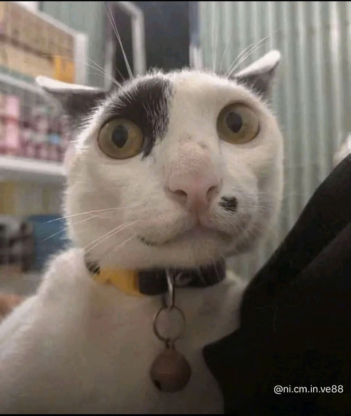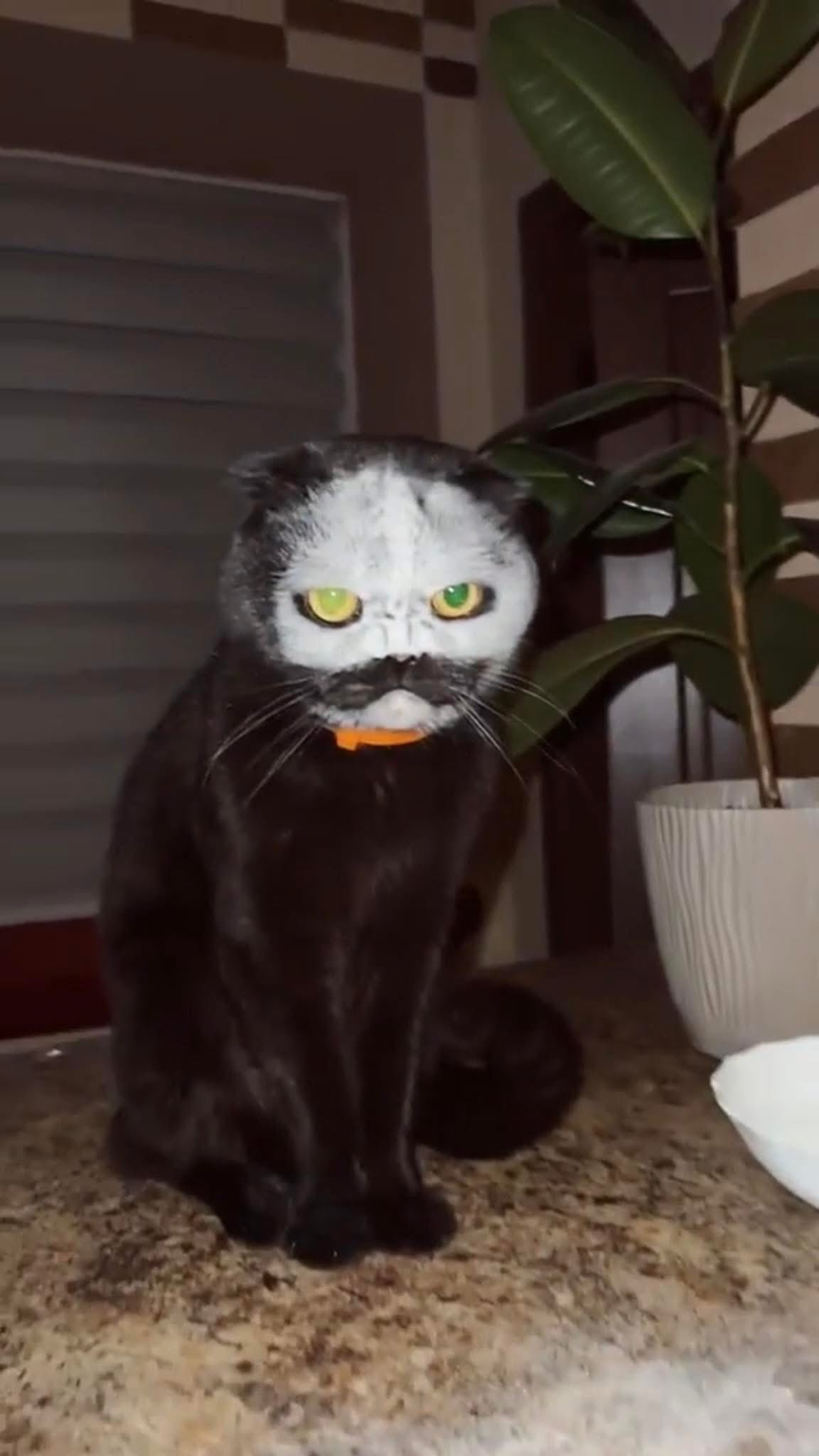Chú mèo đen với khuôn mặt được "trang điểm" trắng toát, tạo thành bộ râu và mặt nạ bí ẩn, cùng với đôi mắt vàng phát sáng. Vẻ ngoài này gợi nhớ đến những nhân vật trong phim kinh dị hoặc một vị "thần mèo" bí ẩn nào đó.