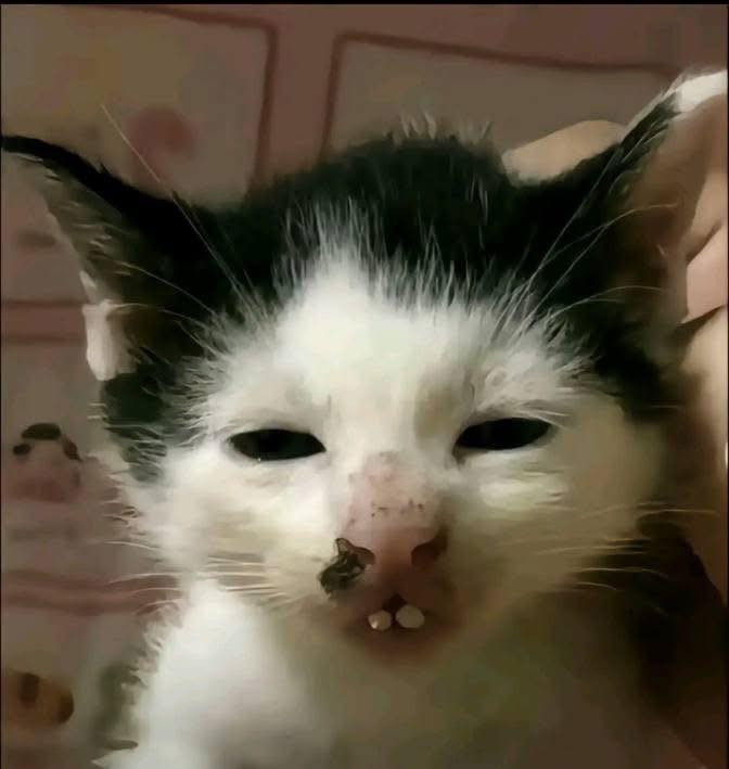 Khuôn mặt buồn bã kết hợp với màu lông loang lổ lạ lùng khiến tổng thể chú mèo trở nên vừa thương vừa buồn cười.