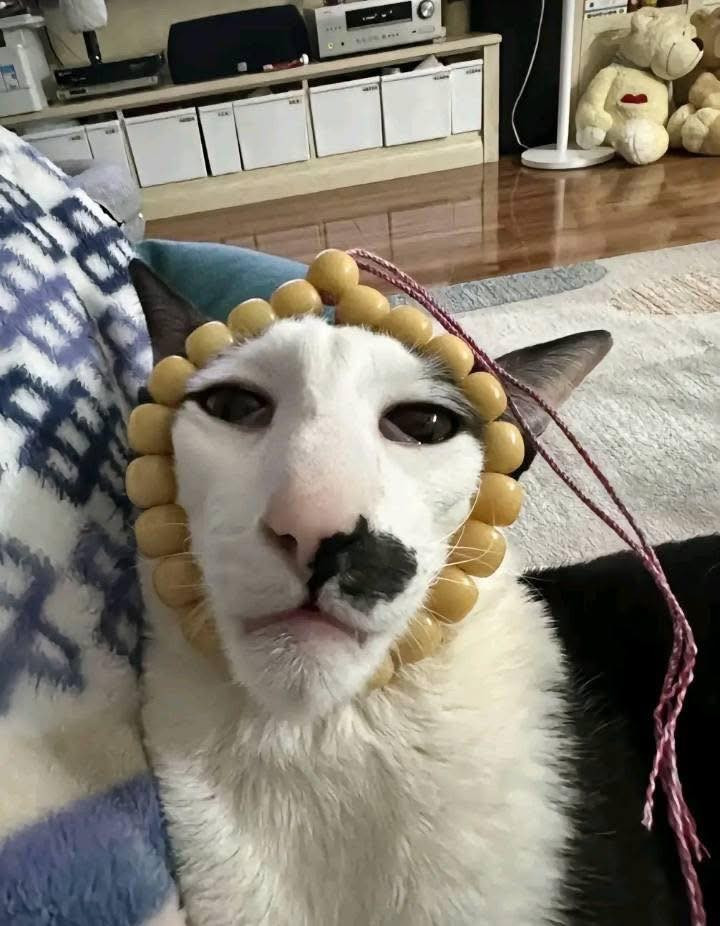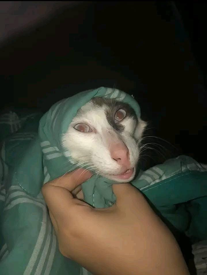 Một chú mèo được quấn trong chăn màu xanh. Dưới ánh sáng yếu, đôi mắt của nó trở nên lờ đờ, vô hồn, khuôn mặt nhăn nhó. Hình ảnh này đã trở thành meme phổ biến cho những ai đang cố gắng vượt qua một ngày tồi tệ.