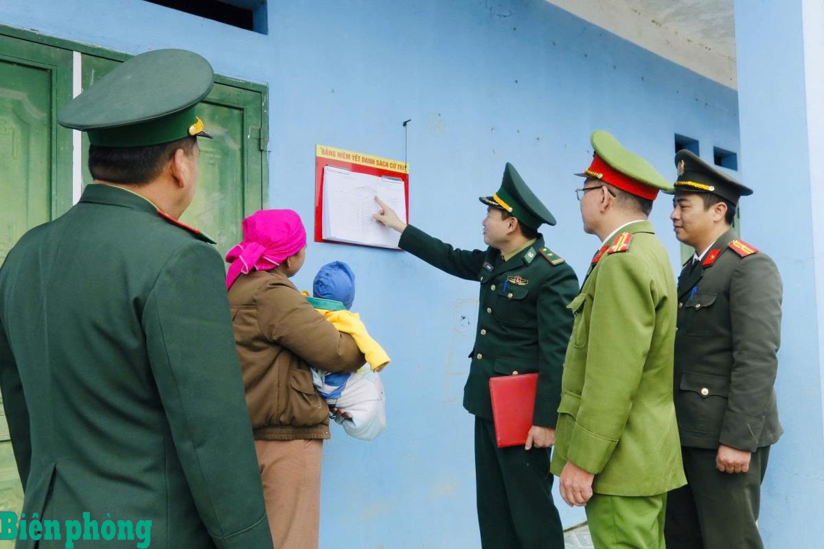 Cán bộ Đồn Biên phòng Tùng Vài cùng các lực lượng chức năng xã Tùng Vài hướng dẫn người dân quy trình bầu cử. Ảnh: Hoàng Chính