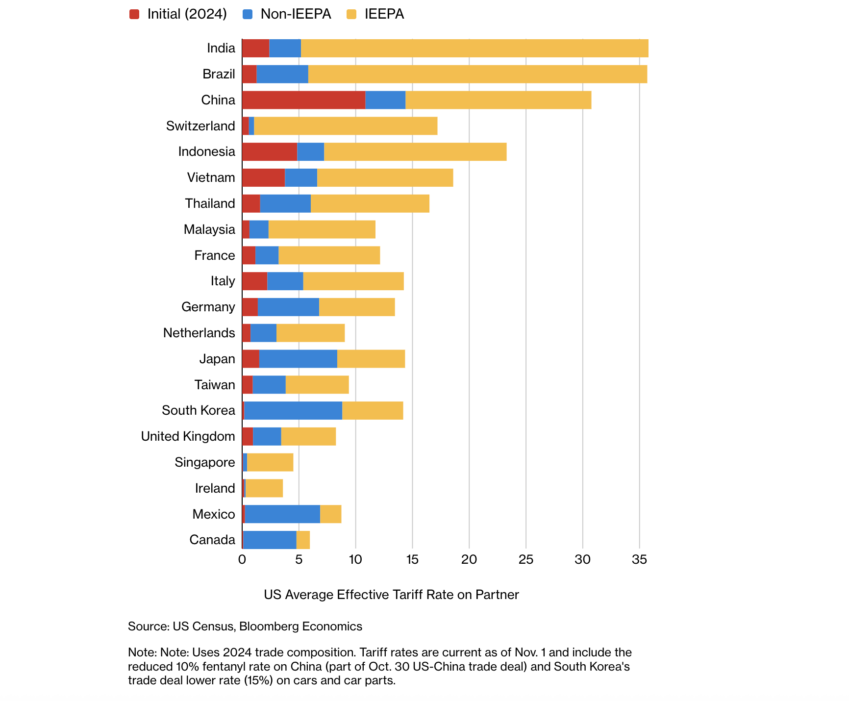 Theo Bloomberg, trong bức tranh tổng quan về những quốc gia và khu vực có thể bị ảnh hưởng nếu phán quyết cuối cùng không đứng về phía Nhà Trắng, Ấn Độ và Trung Quốc là hai trong số các mục tiêu lớn nhất của thuế quan Mỹ, trong khi Brazil cũng bị đánh thuế ở mức rất cao. Thụy Sĩ, đáng chú ý, cũng bị liệt vào danh sách chịu thuế bất ngờ.
