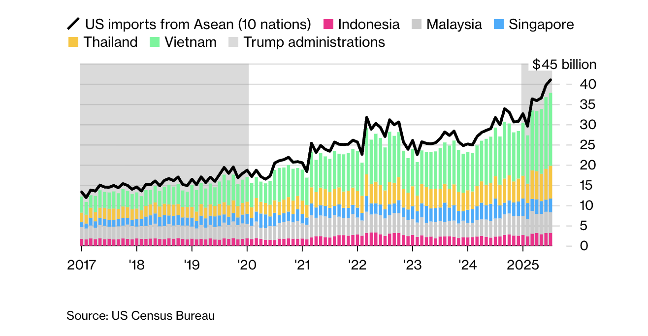 Nhập khẩu của Mỹ từ Đông Nam Á tăng vọt trong năm nay. Biểu đồ: Bloomberg.
