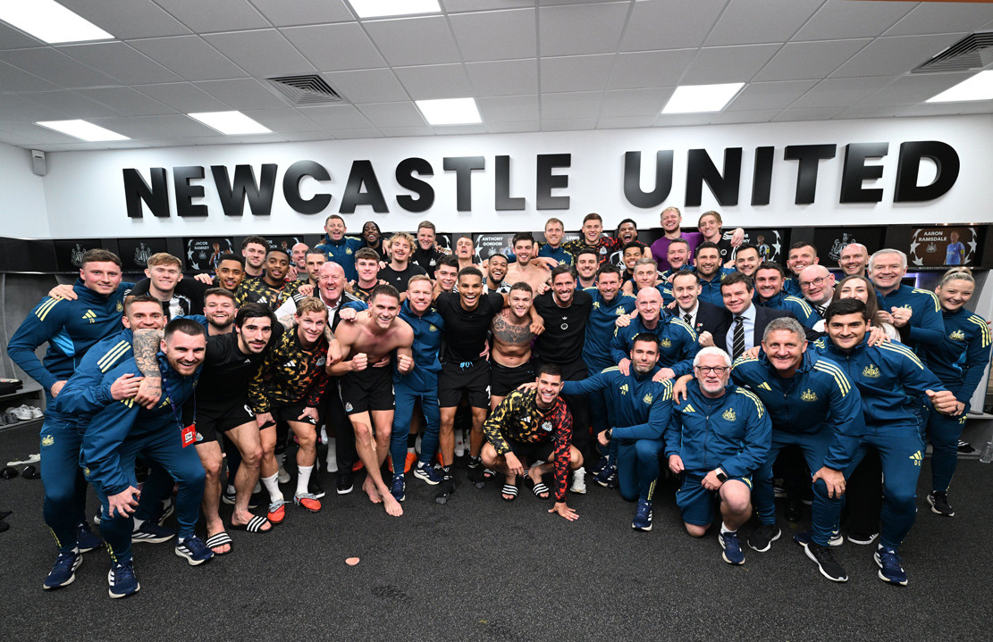 Các cầu thủ và ban huấn luyện Newcastle chụp ảnh kỷ niệm trong phòng thay đồ