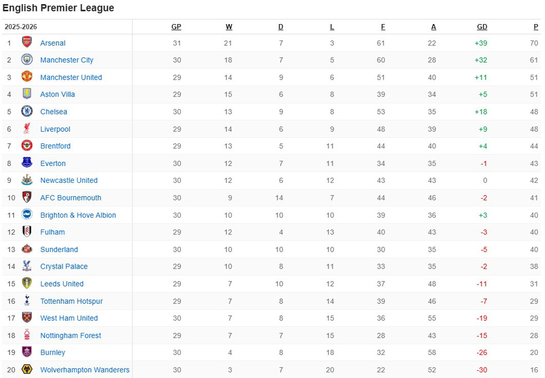 BXH Premier League
