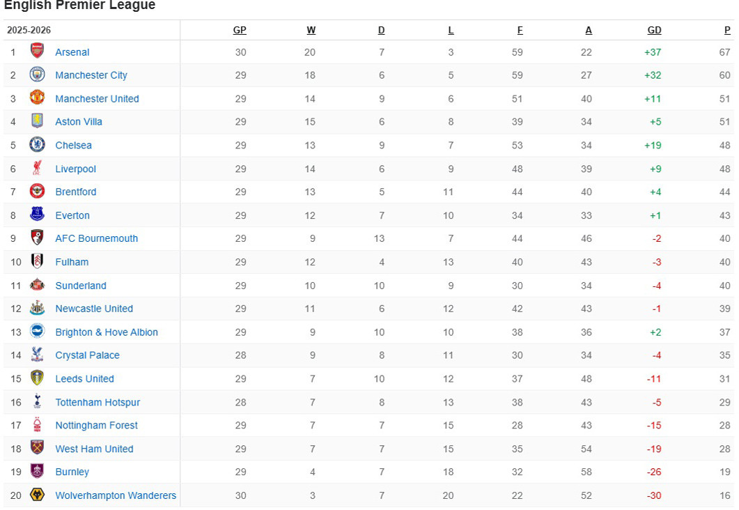 BXH Premier League sau vòng 29