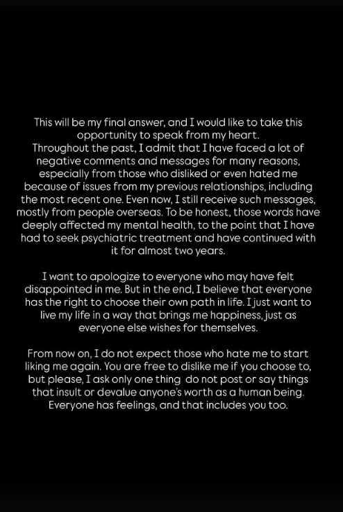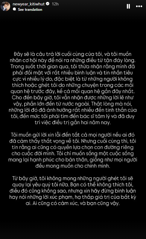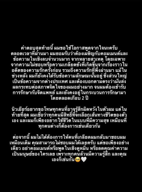 Khoảng 2h sáng 10/11 (theo giờ Việt Nam), cập nhật một loạt Story trên Instagram cá nhân bằng tiếng Thái, tiếng Anh và tiếng Việt. Anh cho biết phải đối mặt với rất nhiều chỉ trích và nó ảnh hưởng tới tinh thần anh đến mức phải tìm đến bác sĩ tâm lý và duy trì điều trị trong gần 2 năm qua.