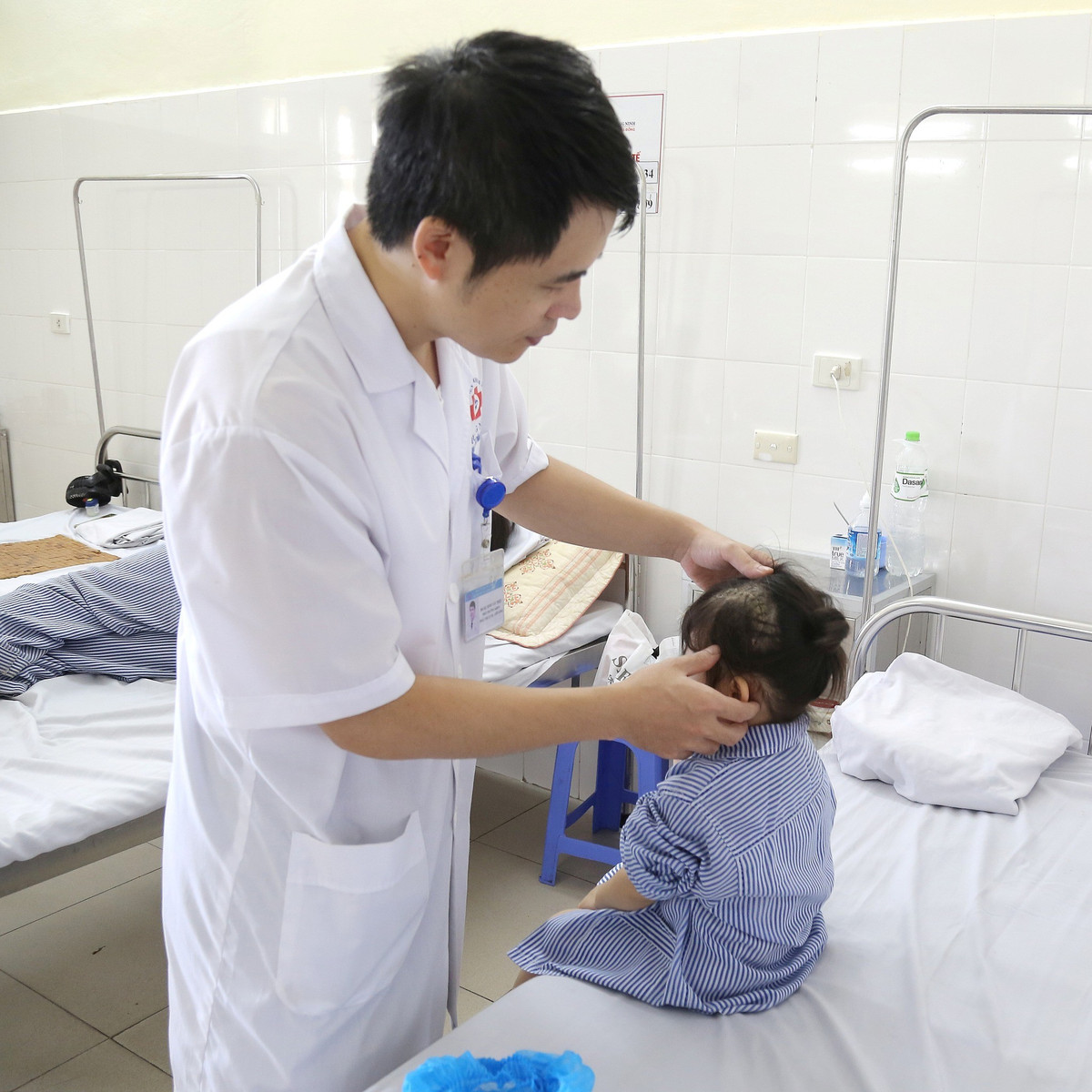 Bác sĩ CKI Đinh Văn Triệu, Phó khoa phụ trách khoa Phẫu thuật Thần kinh – Cột sống kiểm tra vết mổ cho cháu bé 3 tuổi sau phẫu thuật sọ não - Ảnh BVCC