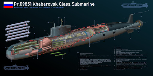 Khabarovsk thuộc Dự án 09851, phát triển dựa trên khung của tàu ngầm lớp Borei – loại chuyên mang tên lửa đạn đạo chiến lược.