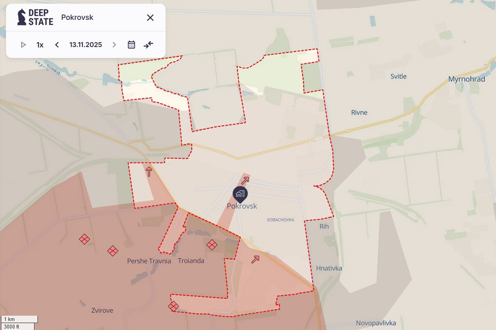 Theo bản đồ cập nhật chiến sự ở Pokrovsk do trang Deep State cung cấp, vùng xám, tức khu vực nổ ra giao tranh giữa quân Nga và các đơn vị phòng thủ Ukraine, đang bao trùm phần lớn thành phố này.