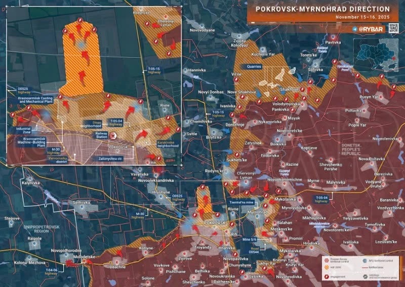 Bản đồ chiến sự Ukraine ngày 16/11/2025, hướng Pokrovsk-Myrnohrad. (Ảnh: Rybar)
