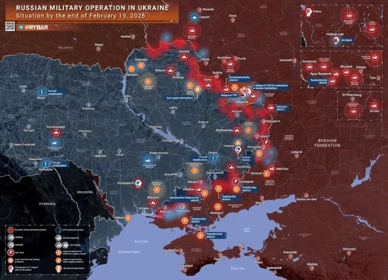 Bản đồ chiến sự Ukraine ngày 19/2. (Ảnh: Rybar)