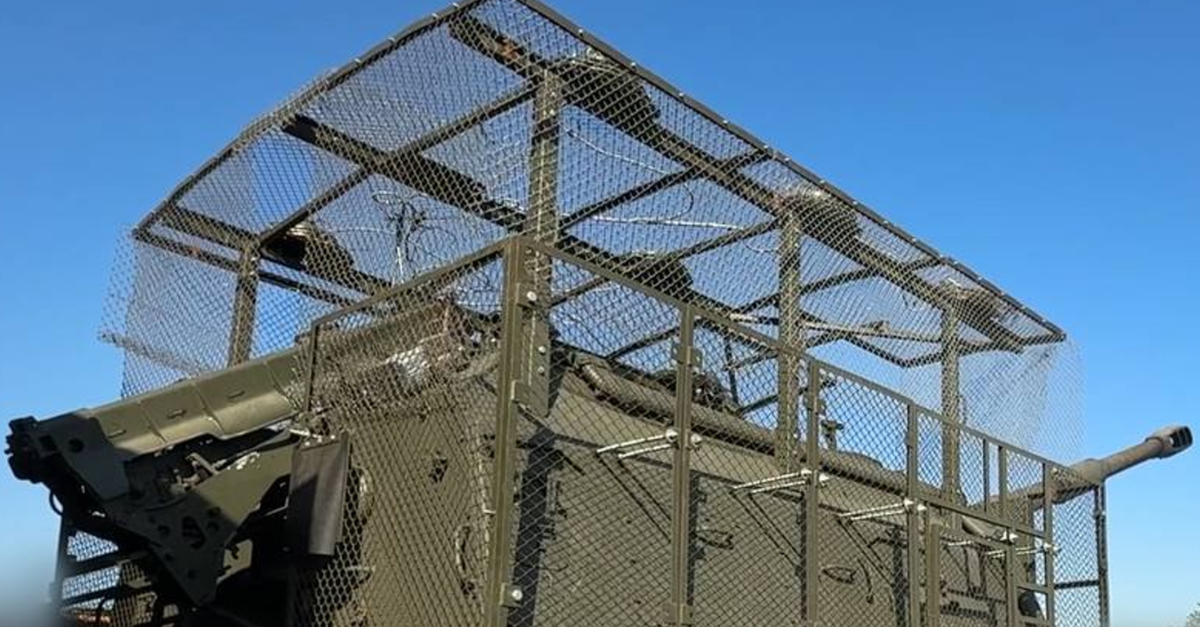 Mặc dù thường thô sơ, nhưng đây là một biện pháp chi phí thấp để cung cấp cho pháo tự hành 152 mm 2S19M2 Msta-S mới ít nhất một phần khả năng bảo vệ chống lại chất nổ do máy bay không người lái mang theo. Ảnh: @defence-blog.