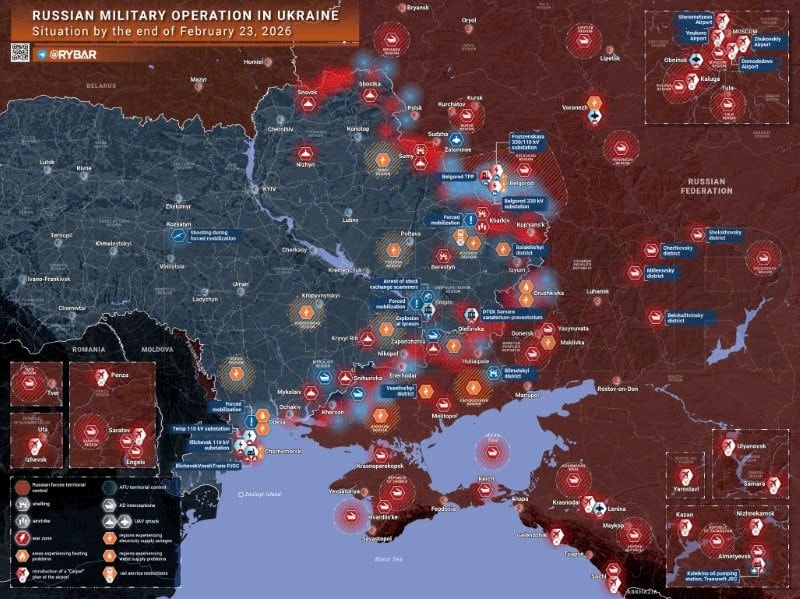 Bản đồ chiến sự Ukraine ngày 23/2. (Ảnh: Rybar)