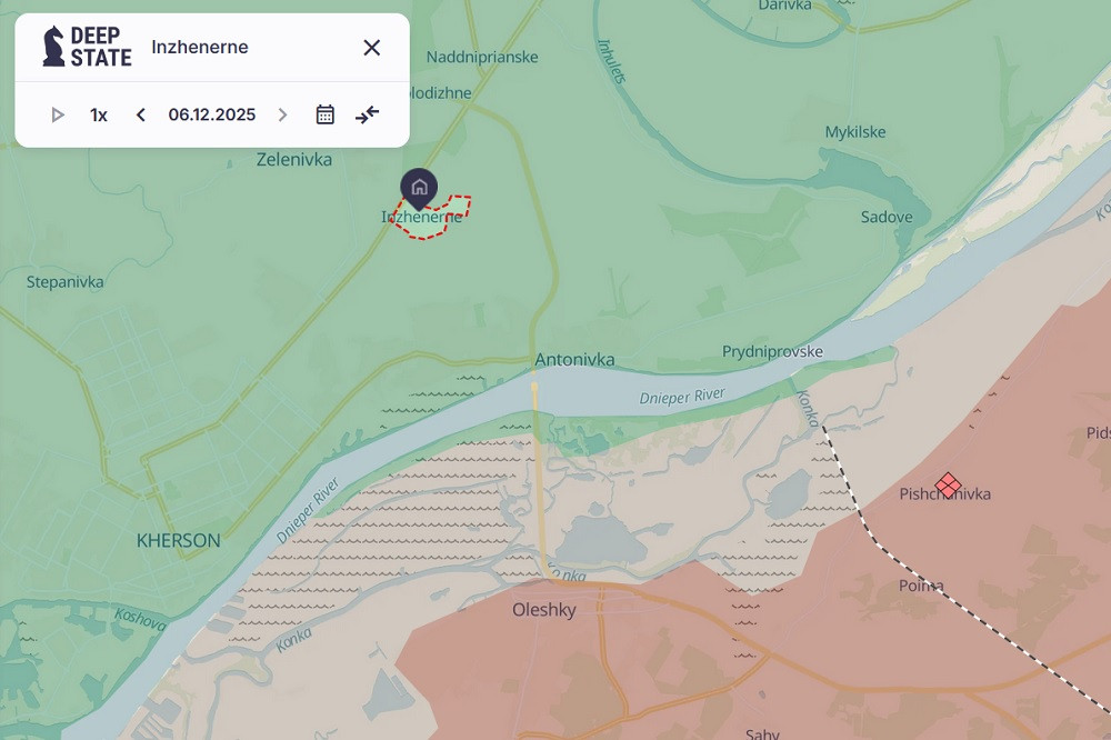 Dựa trên bản đồ do trang Deep State của Ukraine cung cấp, vị trí làng Inzhenerne ở tỉnh Kherson nằm cách vùng đỏ, tức nơi quân Nga kiểm soát, khoảng 10km.