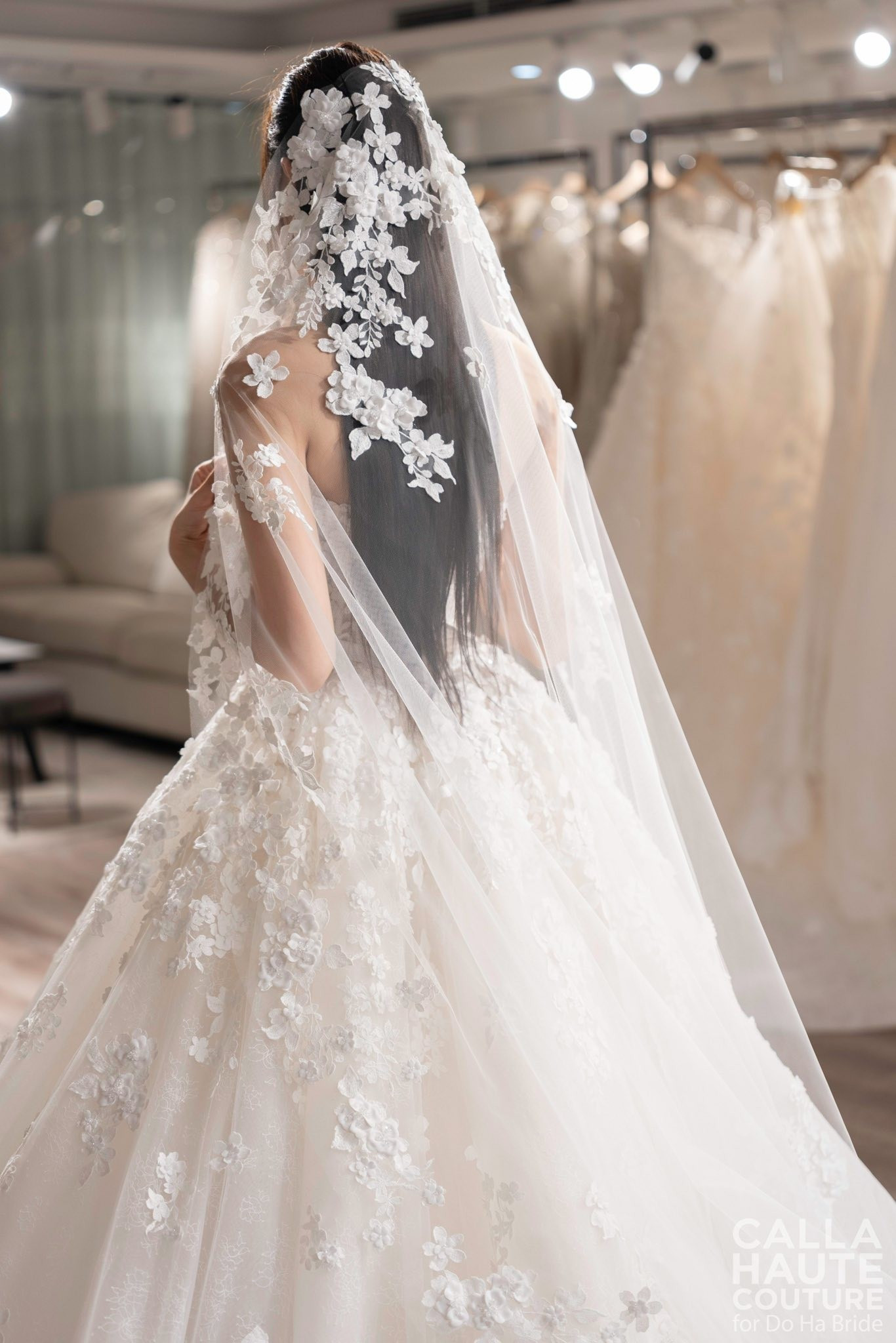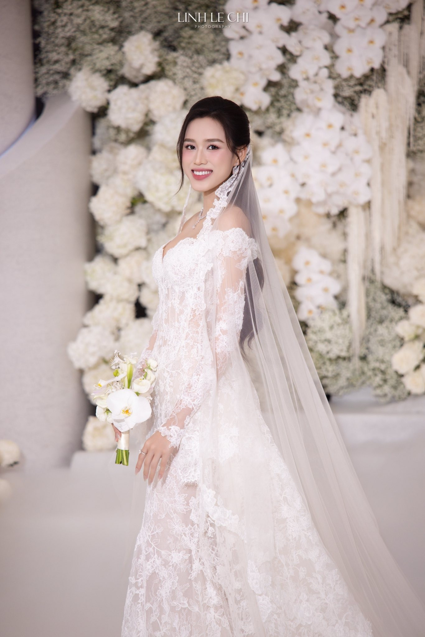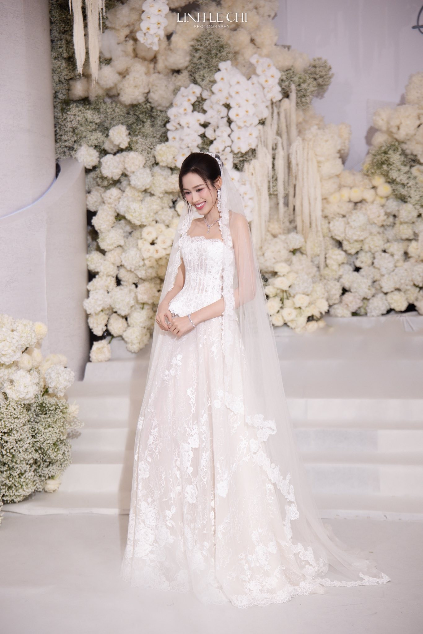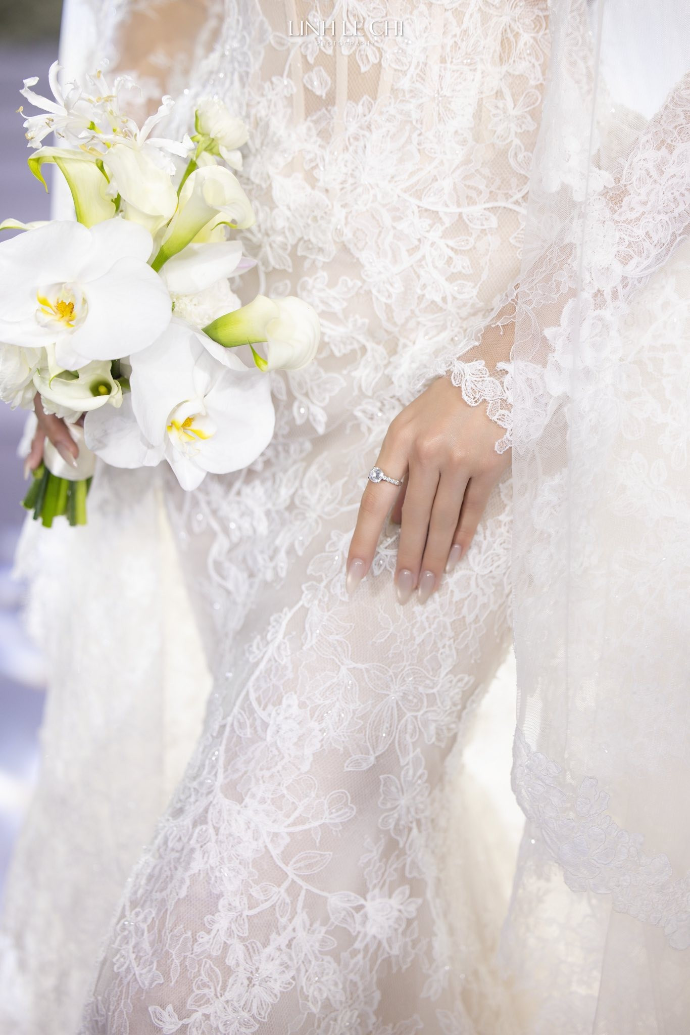 Từng chi tiết được chăm chút tỉ mỉ với hàng ngàn viên pha lê ánh sắc trong vắt, chỉ duy nhất một kích cỡ, được đính kết thủ công thành từng chùm hoa nhỏ, rồi kết lại thành vô số bông hoa lấp lánh trải khắp ren thân váy, tựa như một khu vườn pha lê phản chiếu dưới ánh sáng lễ đường.