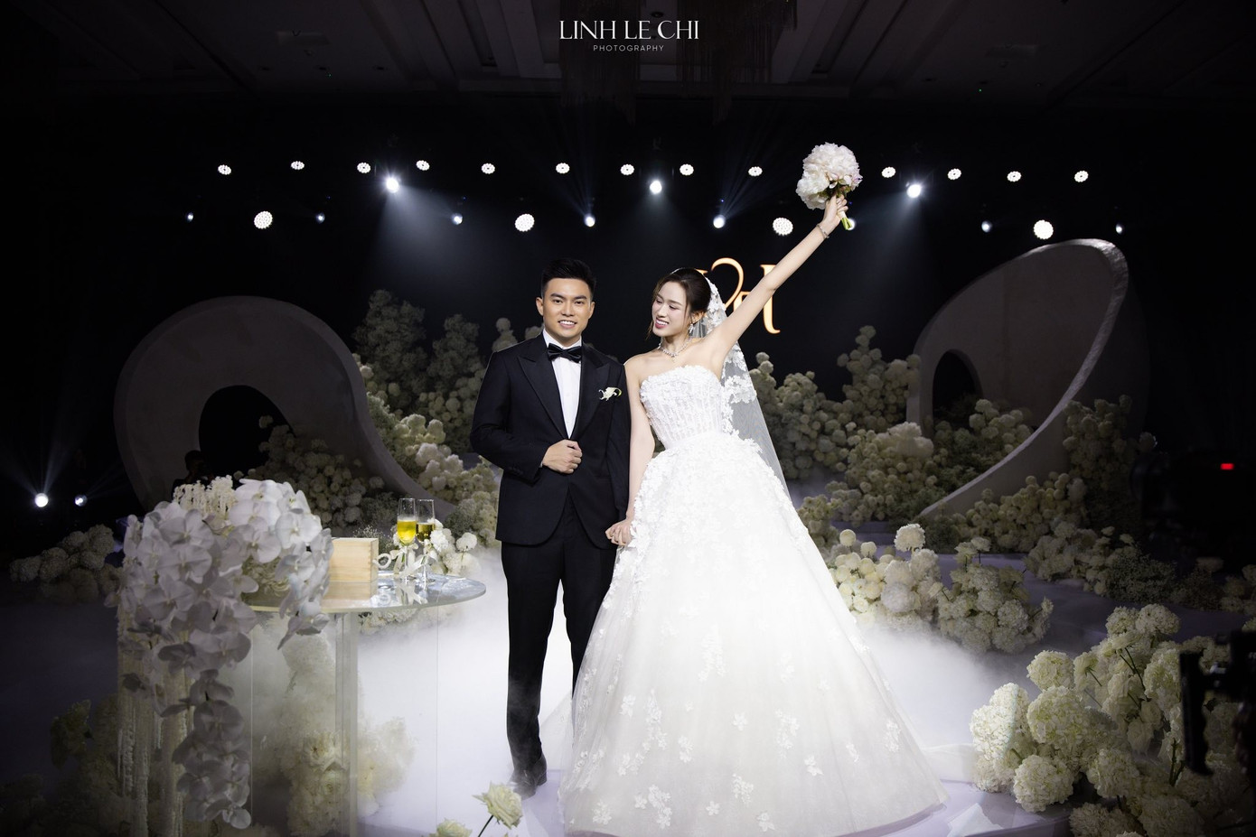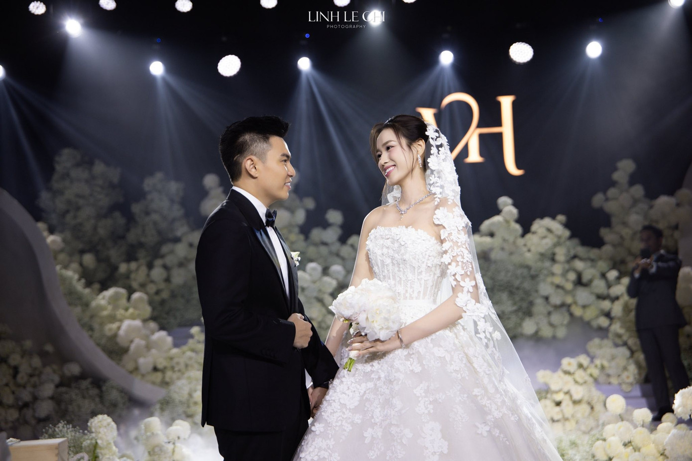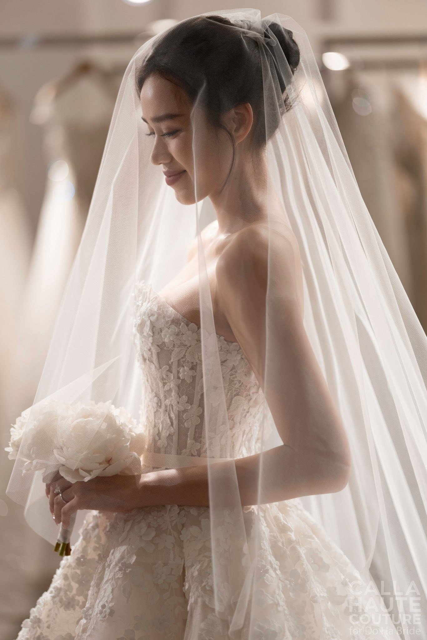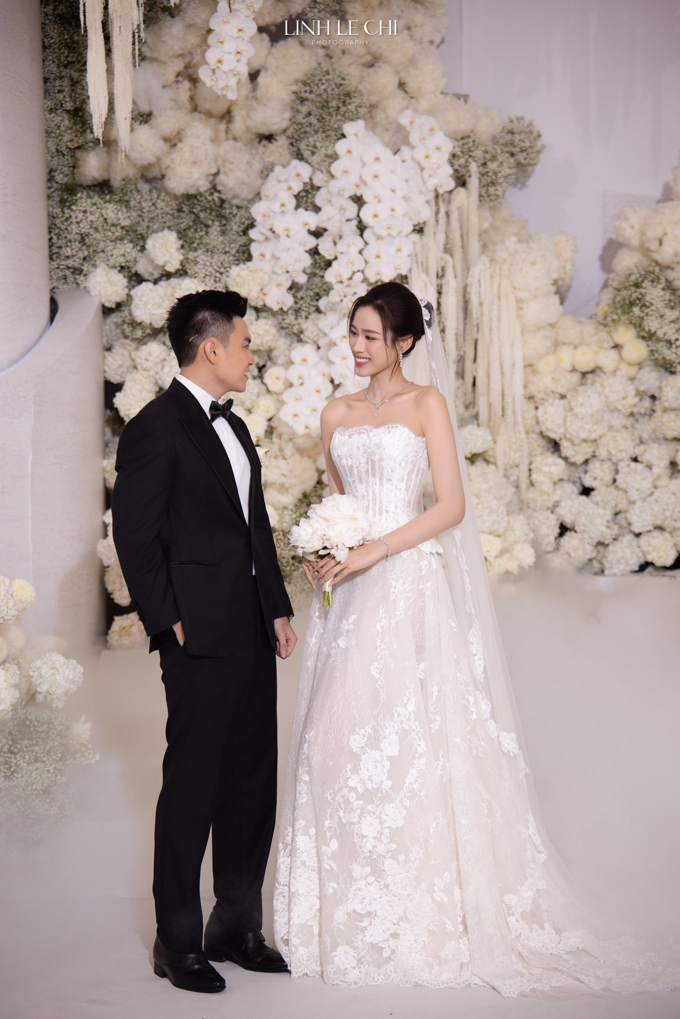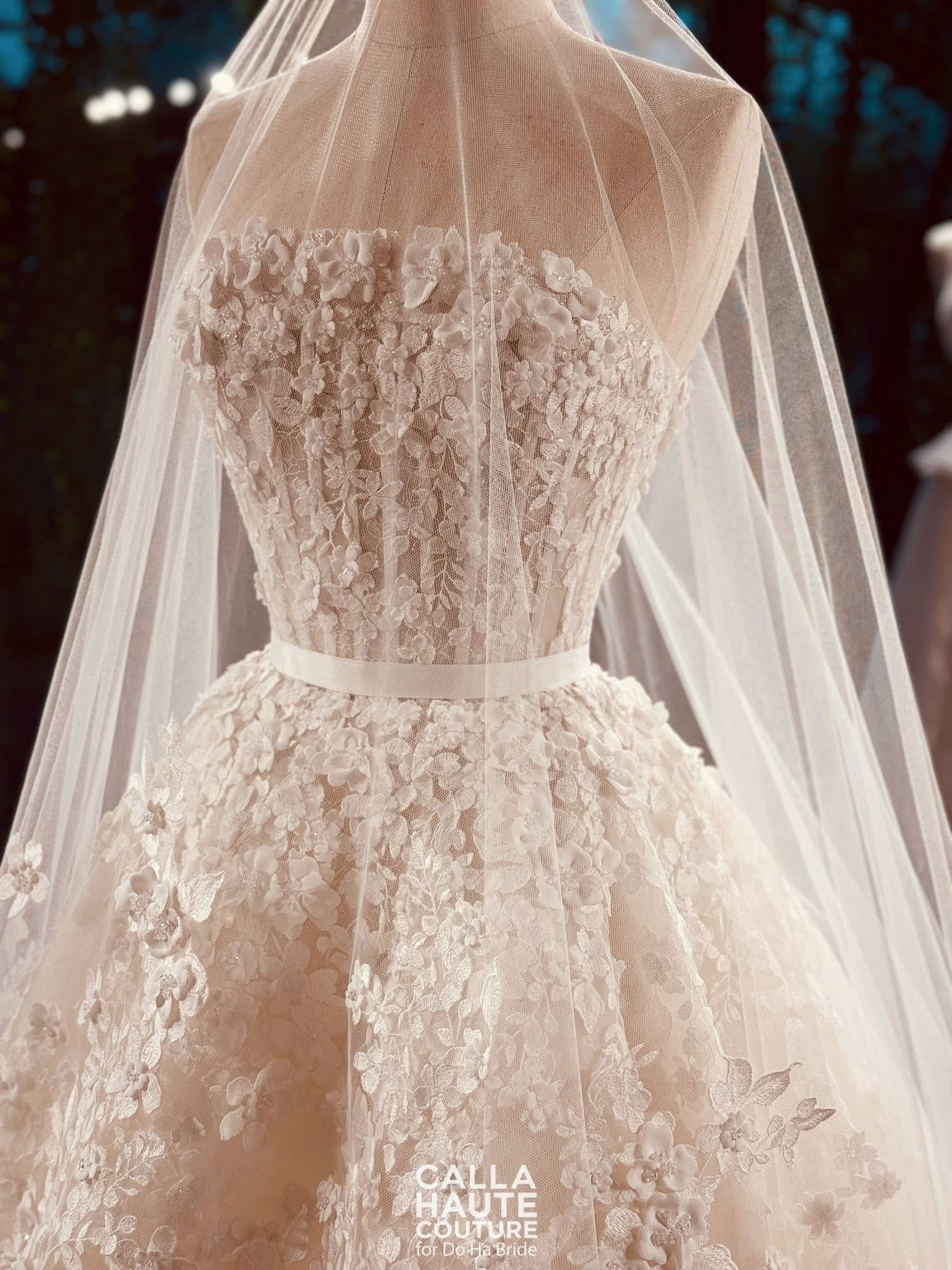 Từng chi tiết được chăm chút tỉ mỉ với hàng ngàn viên pha lê ánh sắc trong vắt, chỉ duy nhất một kích cỡ, được đính kết thủ công thành từng chùm hoa nhỏ, rồi kết lại thành vô số bông hoa lấp lánh trải khắp ren thân váy, tựa như một khu vườn pha lê phản chiếu dưới ánh sáng lễ đường.