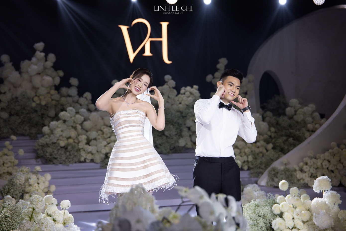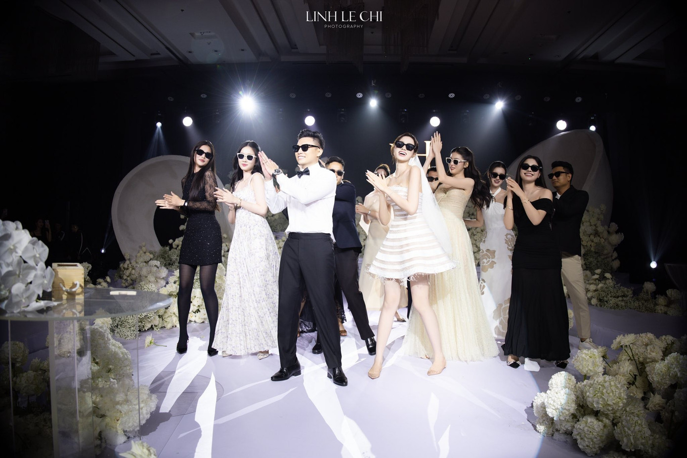Trong bữa tiệc sau đó, nàng hậu diện thiết kế váy ngắn, nhảy múa vui vẻ cùng chú rể và bạn bè.