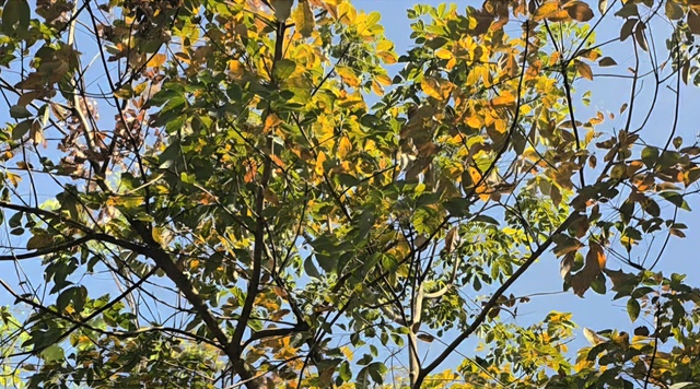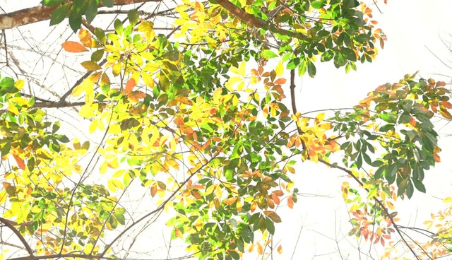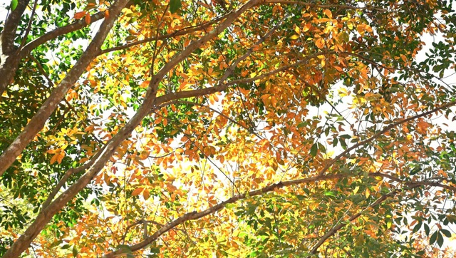 Những tán lá xanh thẫm dần ngả sang vàng, xen lẫn sắc đỏ, sắc cam, rồi lặng lẽ rời cành. Lá rơi không vội, trải thành những tấm thảm mềm dưới gốc cây, kéo dài hun hút theo những con đường đất đỏ bazan quen thuộc.