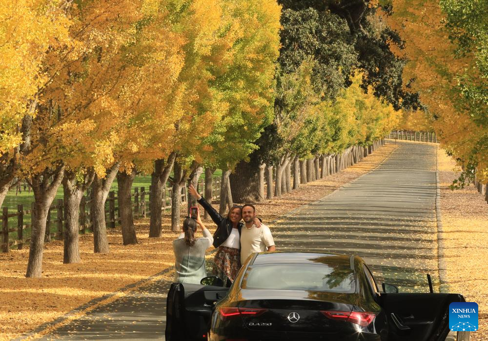Khách du lịch tạo dáng chụp ảnh dưới hàng cây bạch quả vàng rực ở thung lũng Napa ngày 4/11/2025.
