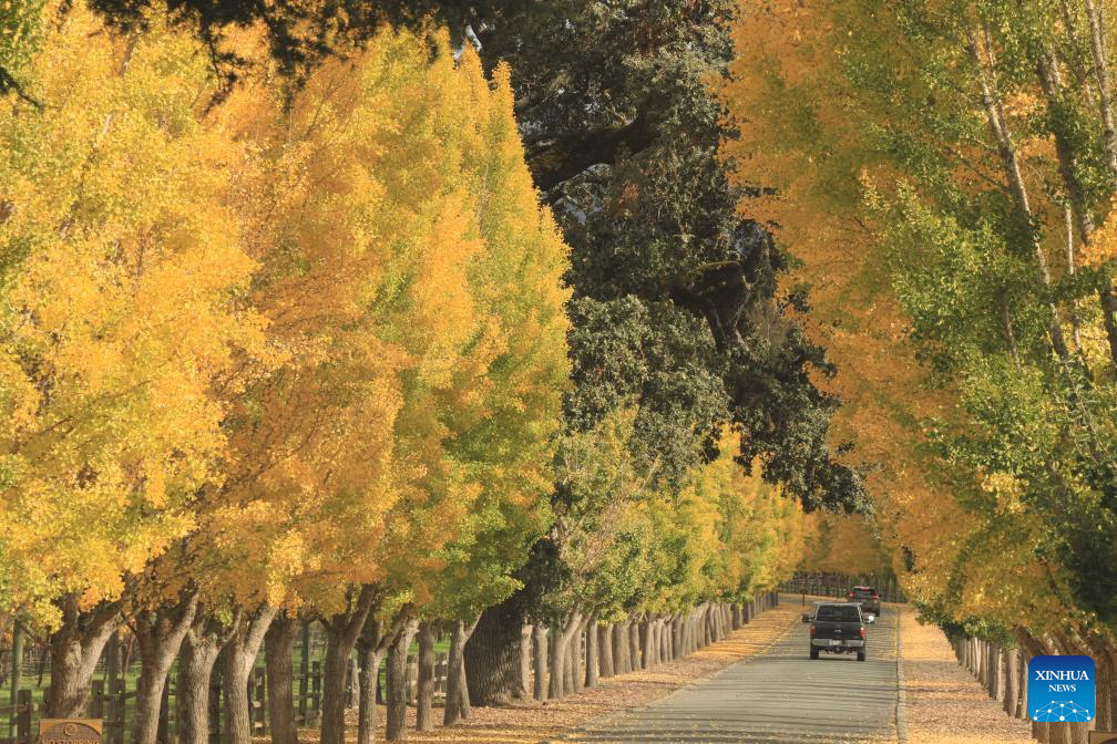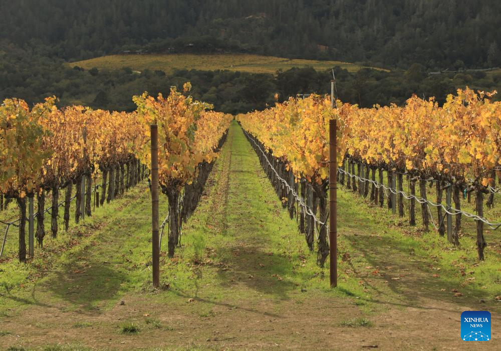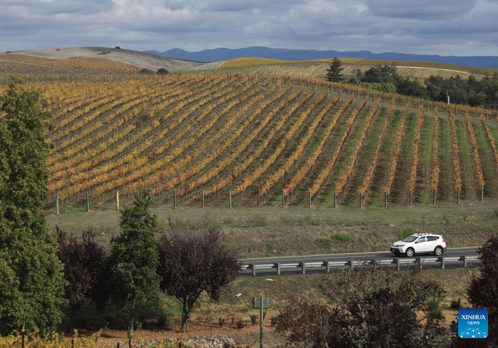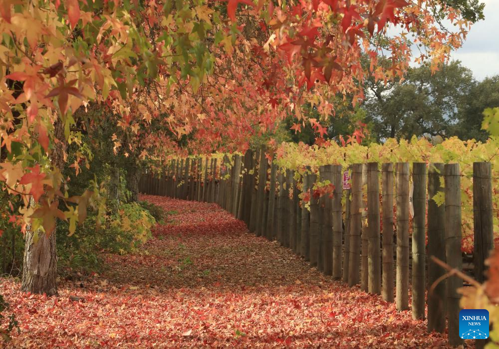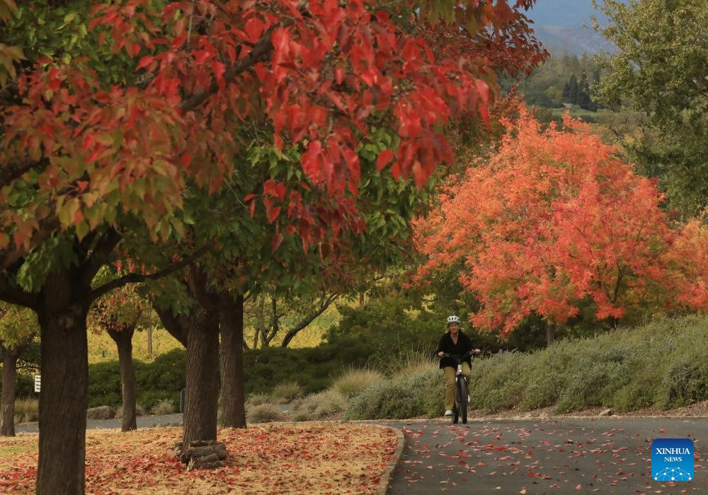 Mùa thu ở thung lũng Napa mang vẻ đẹp ấn tượng, thu hút đông đảo du khách. Ảnh: Một phụ nữ đạp xe tại thung lũng Napa ngày 4/11/2025. (Nguồn ảnh: Xinhua News)
