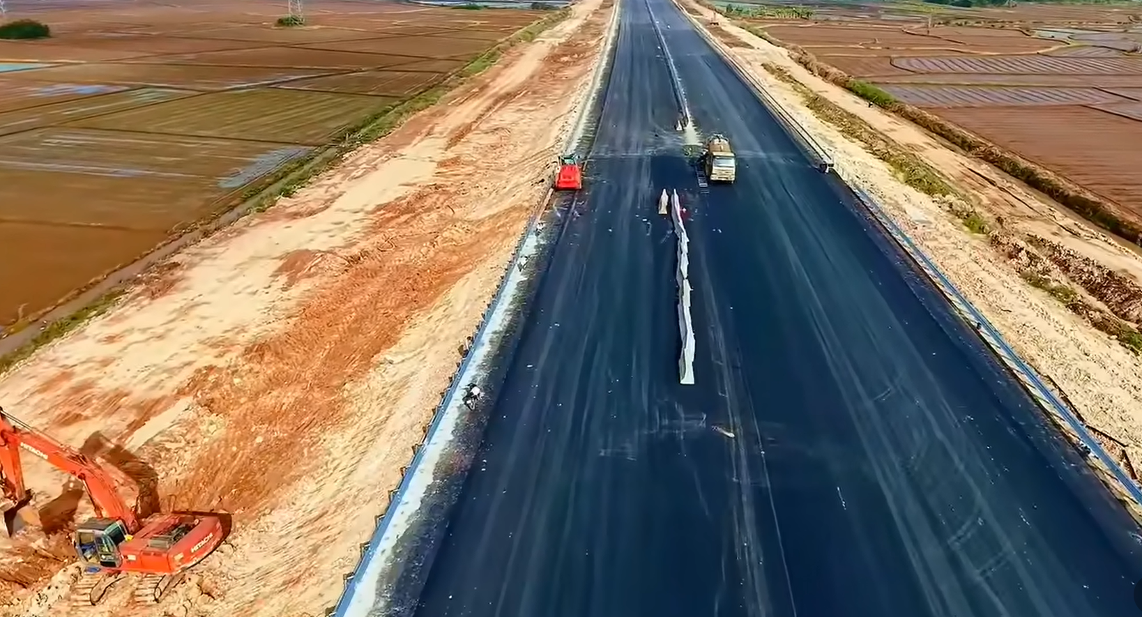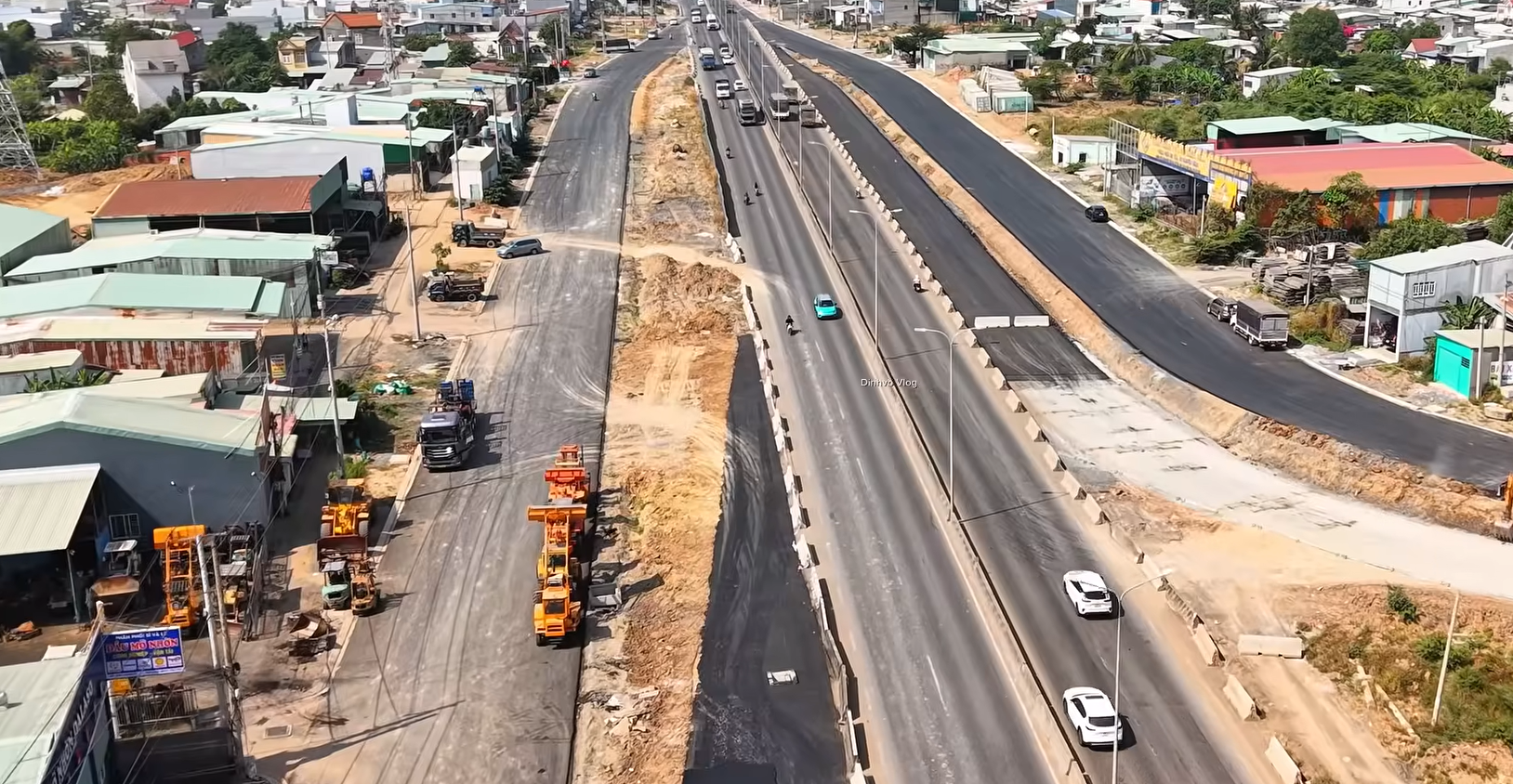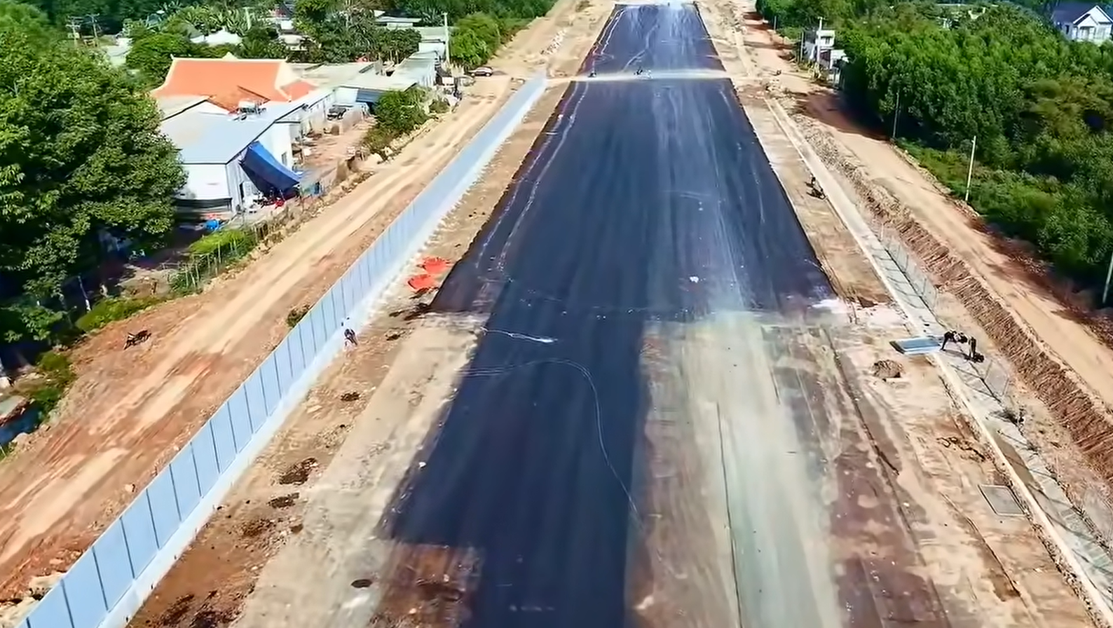 Mặt đường đã cơ bản trải xong nhựa. Đơn vị thi công đang lắp đặt dải phân cách. Ảnh: Đình Võ.
