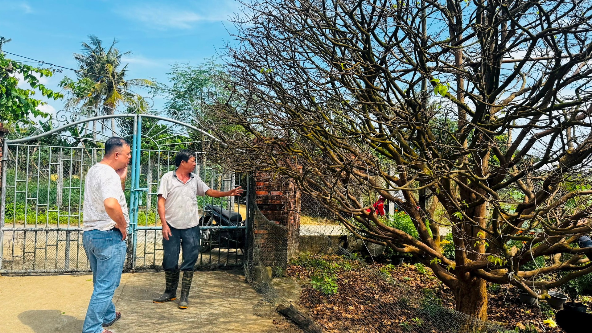 Khách đến vườn nhà ông Tân chiêm ngưỡng cây mai cổ thụ.