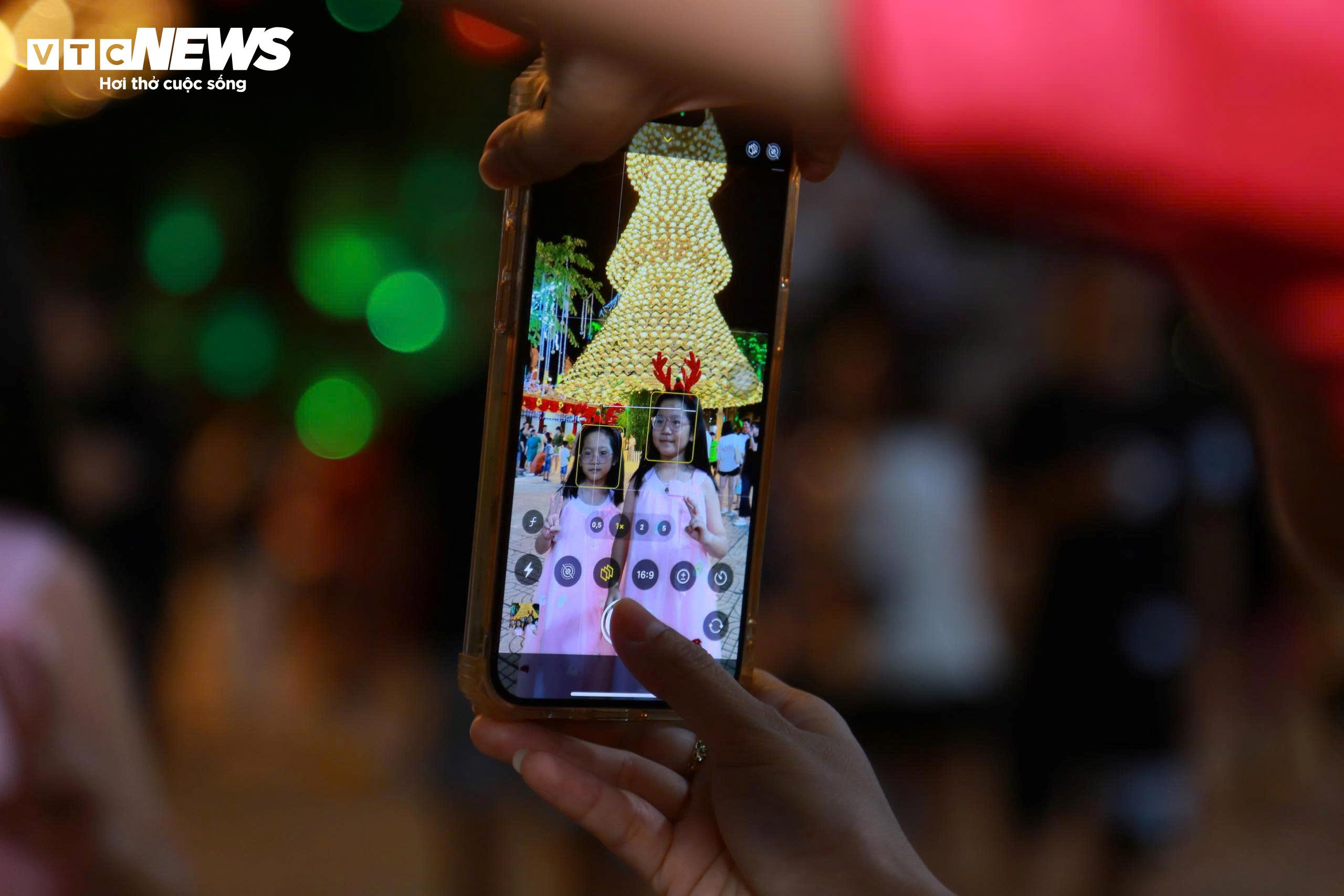 Du khách ghi lại hình ảnh cây thông bằng điện thoại. Càng về tối, lượng người đổ về khuôn viên nhà thờ càng đông.