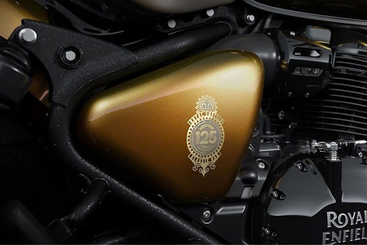 Tôn thêm nét sang trọng là huy hiệu kỷ niệm 125 năm được dập nổi màu vàng trên bình xăng – biểu tượng cho bề dày lịch sử và sức hút toàn cầu của Royal Enfield.