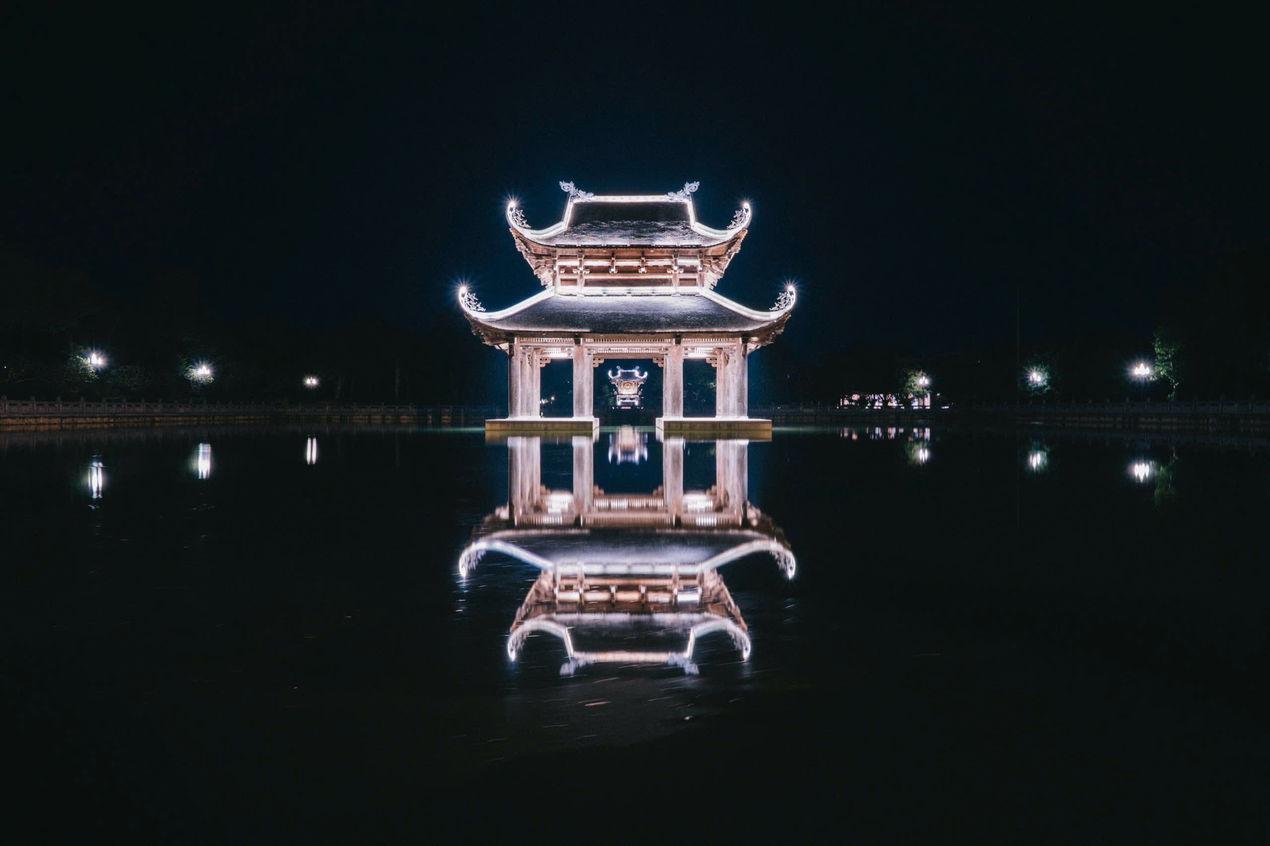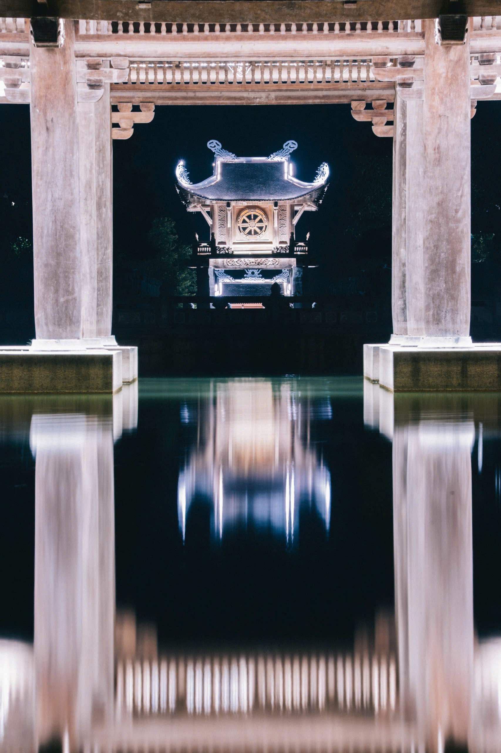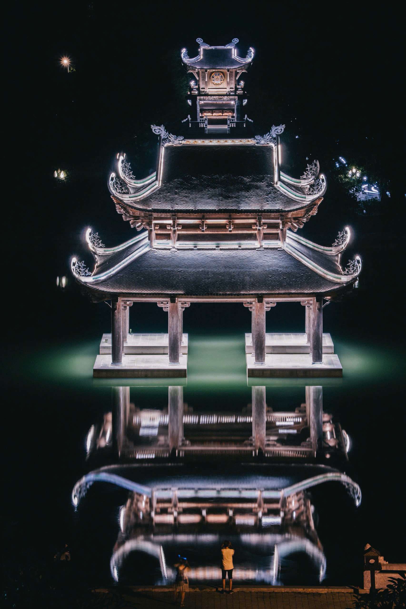 Giữa trời đêm, tháp Báo Thiên rực sáng và in bóng xuống mặt hồ phía trước. Ảnh: Nguyễn Đức Hiếu