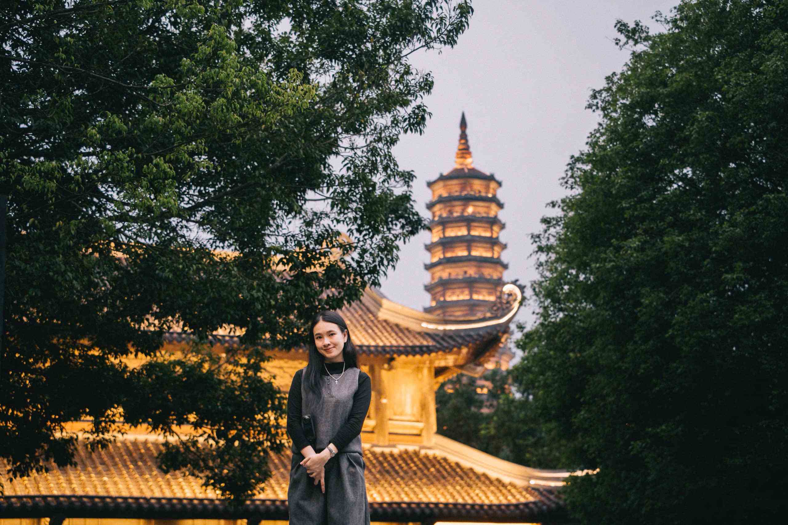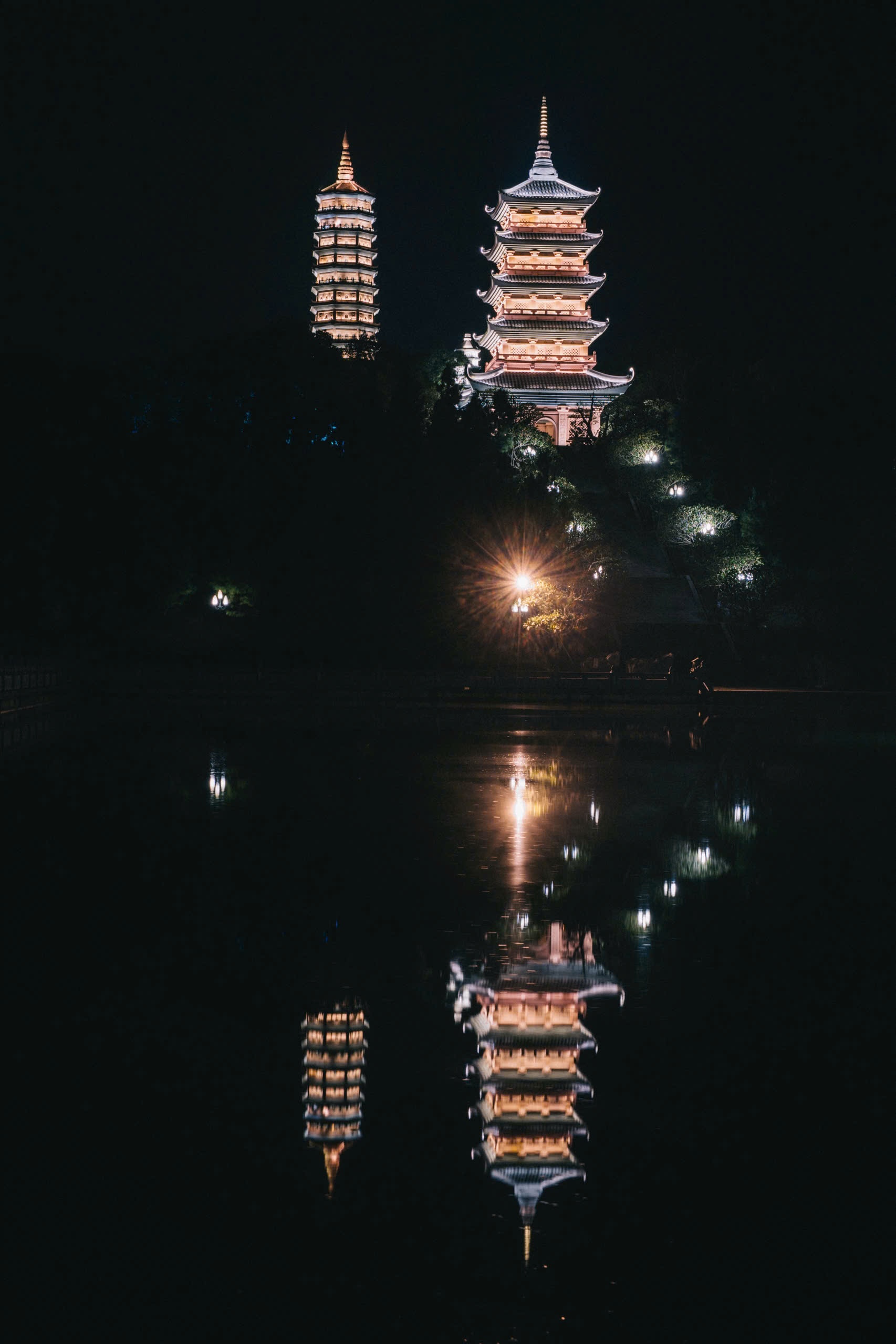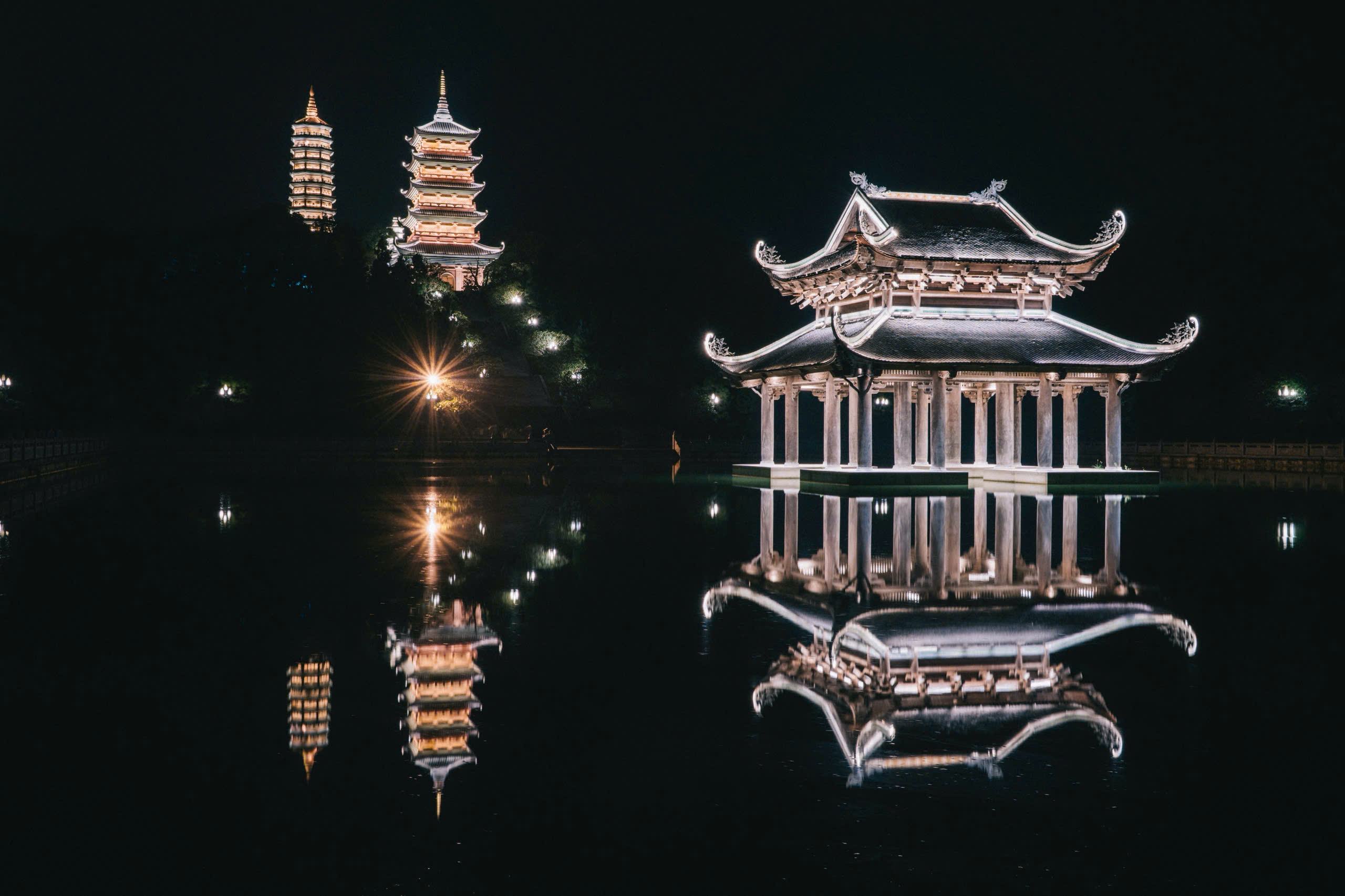 Giữa trời đêm, tháp Báo Thiên rực sáng và in bóng xuống mặt hồ phía trước. Ảnh: Nguyễn Đức Hiếu