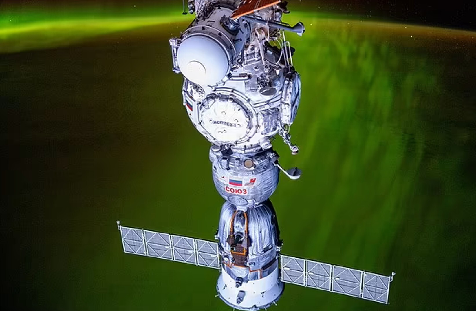 "Video tua nhanh cảnh mặt trăng lặn xuống những dải cực quang đỏ và xanh lá cây, tiếp theo là cảnh mặt trời mọc chiếu sáng tàu Soyuz bằng ánh sáng xanh nhạt", ông Dominick viết trong chú thích video mới nhất của mình.