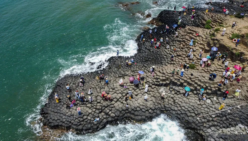 Du khách thích thú ghi lại hình ảnh check-in ở di tích quốc gia đặc biệt Gành Đá Đĩa.