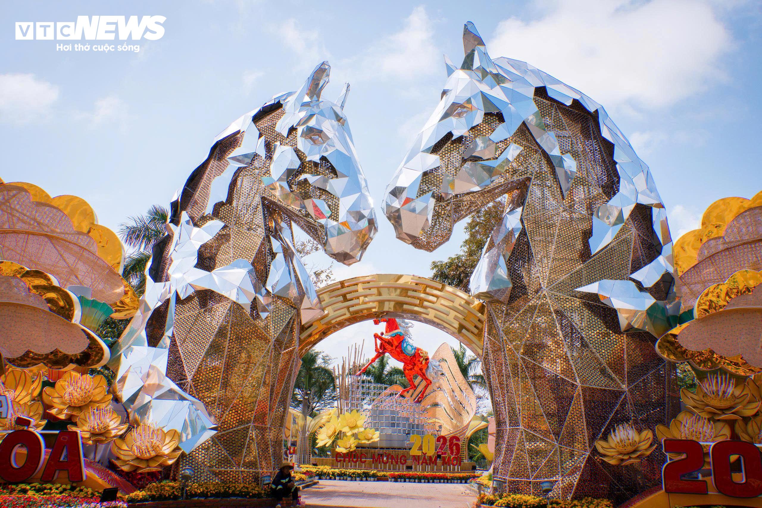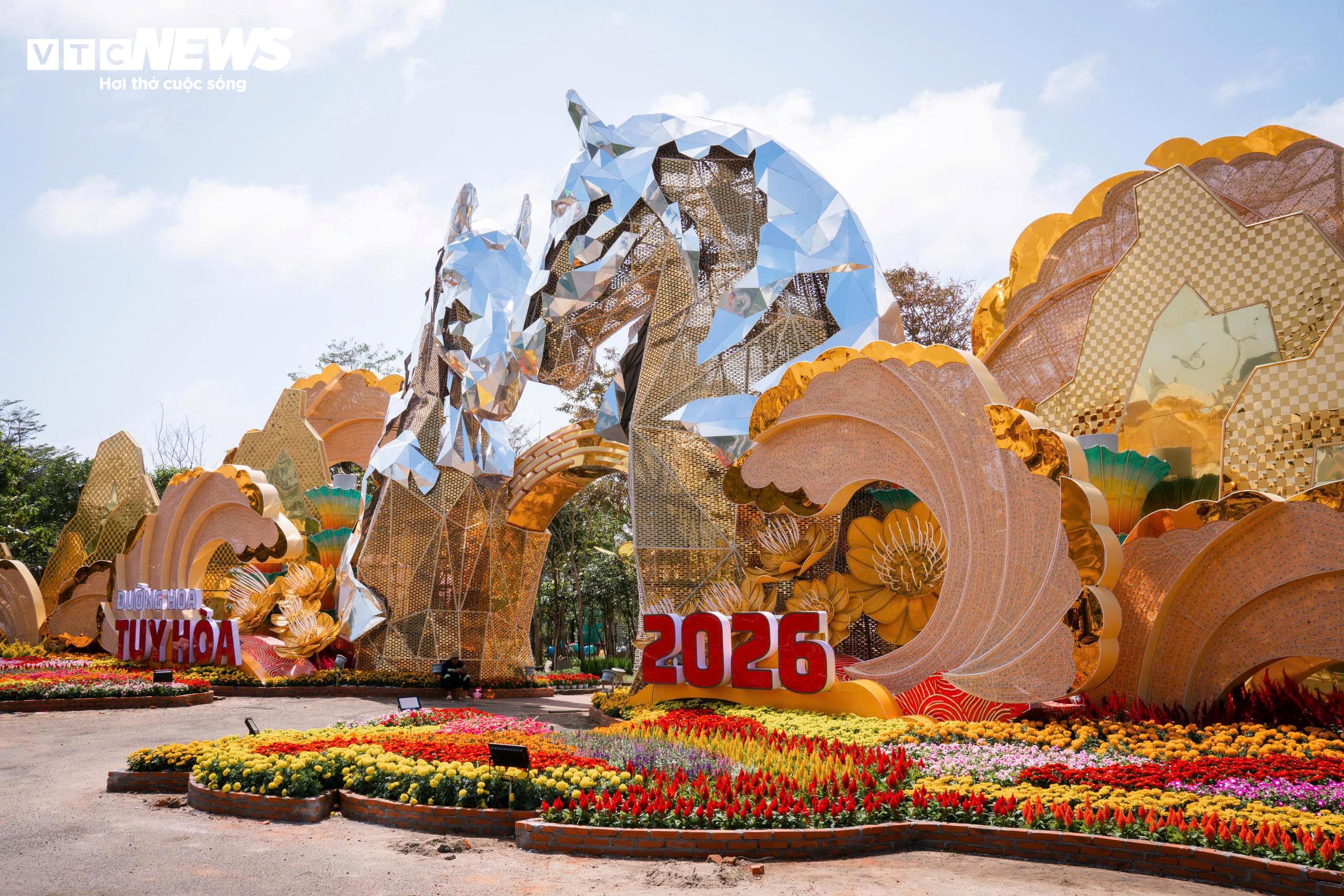 Về quy mô, Đường hoa Tuy Hòa Xuân Bính Ngọ 2026 có tổng diện tích trang trí khoảng 3.000m², gồm 3 đại cảnh chính và nhiều tiểu cảnh, sử dụng khoảng 70.000 giỏ hoa các loại, kết hợp hệ thống điện chiếu sáng nghệ thuật.